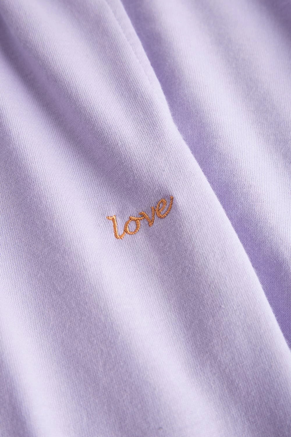 Schmale 7/8-Hose mit Eingriffstaschen, orangener Stickerei „love“ und Gummibund mit Bändel in weiß.