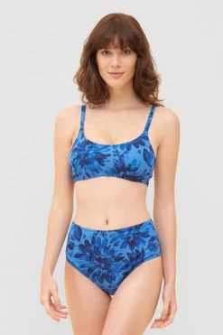 Hohe Bikini Hose Im Blauen Blüten-Druck Tailliert Recyceltes Polyester/Elasthan