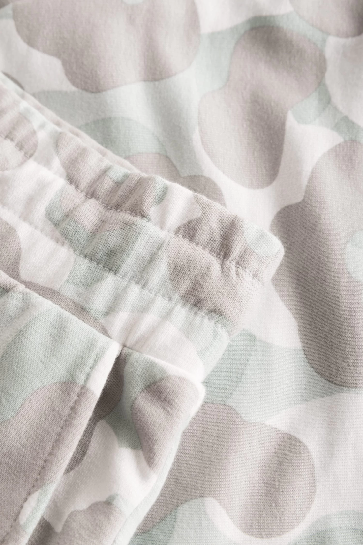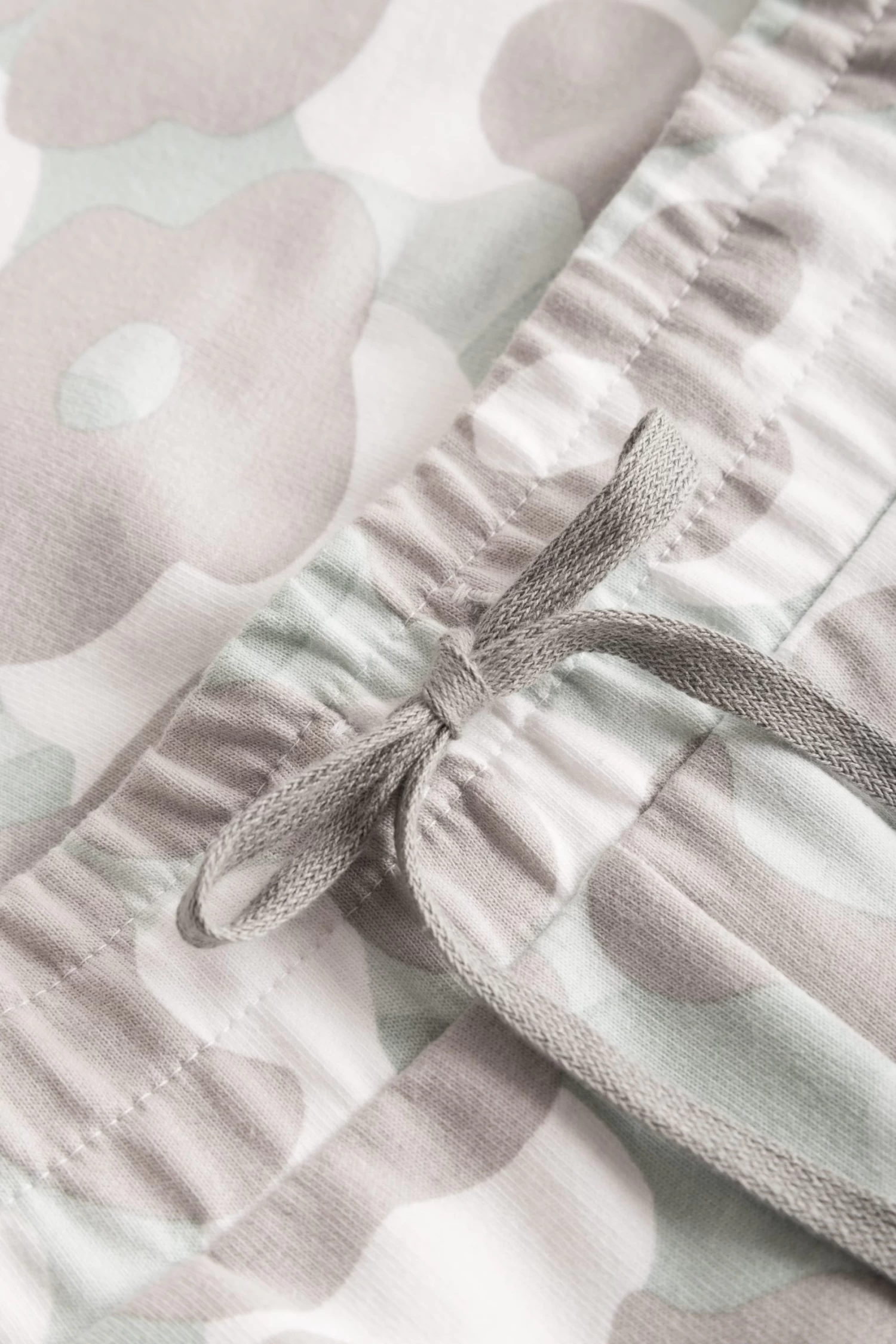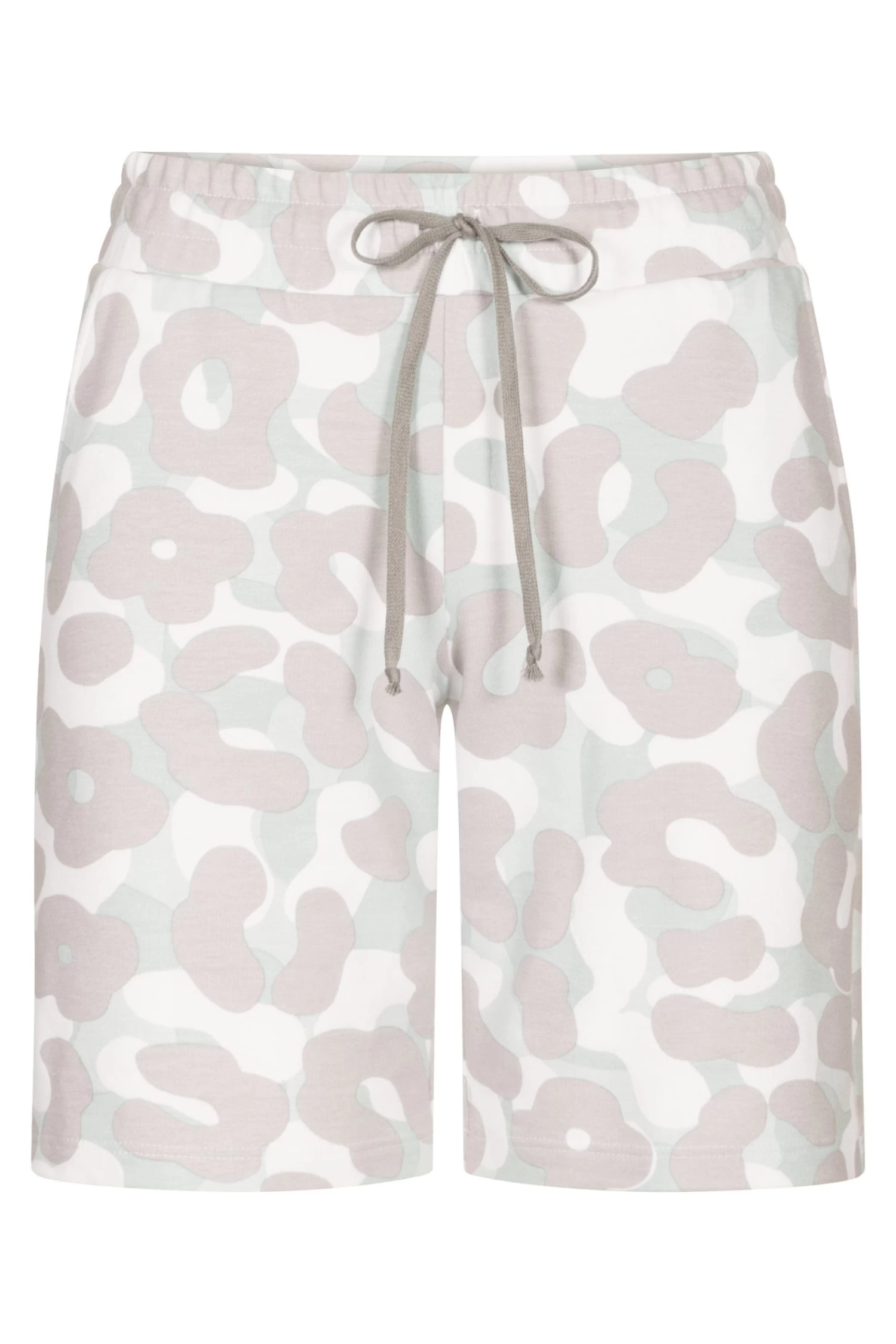 Bermuda aus bedruckter Sweatware mit stilisiertem Camouflage-Muster. Zwei Seitentaschen und eine Gesäßtasche bieten Komfort. Der breite elastische Bund ist mit zusätzlichem Kordelzug gearbeitet.