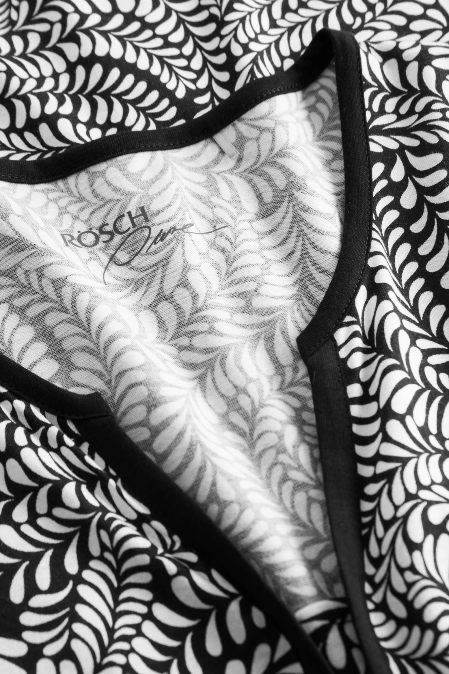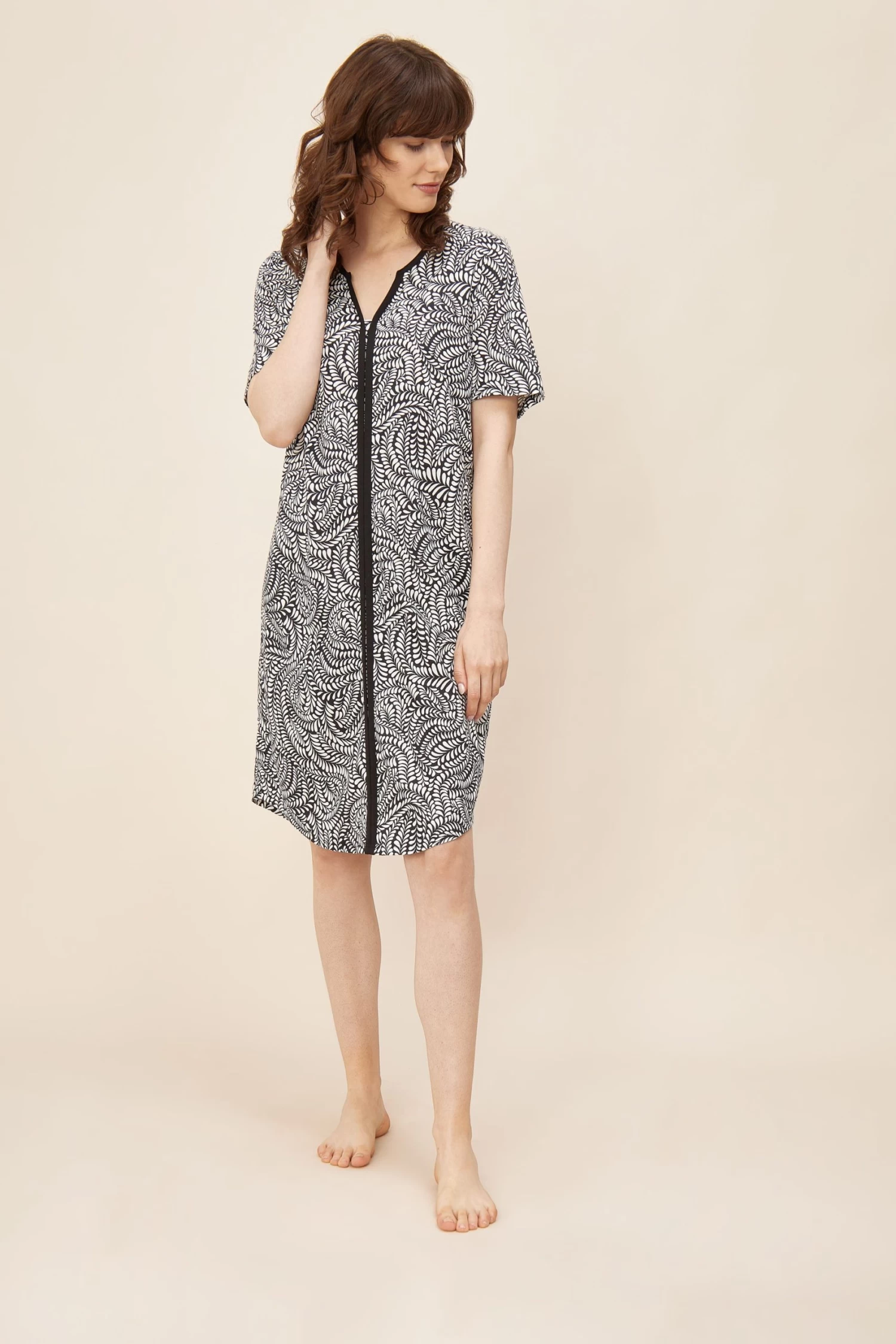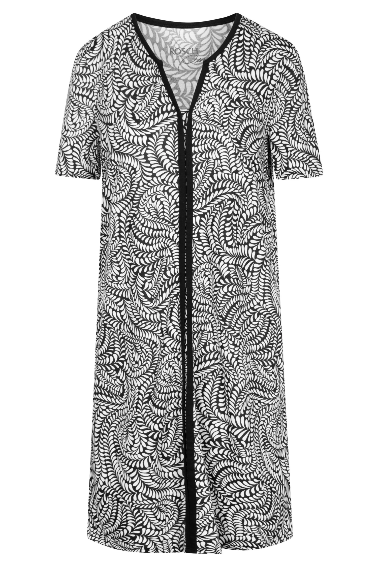 Halbarm Nachtkleid in Schwarz-Weiß-Druck mit raffinierter Verarbeitung in vorderer Mitte in Schwarz und leicht gerundetem Saum.