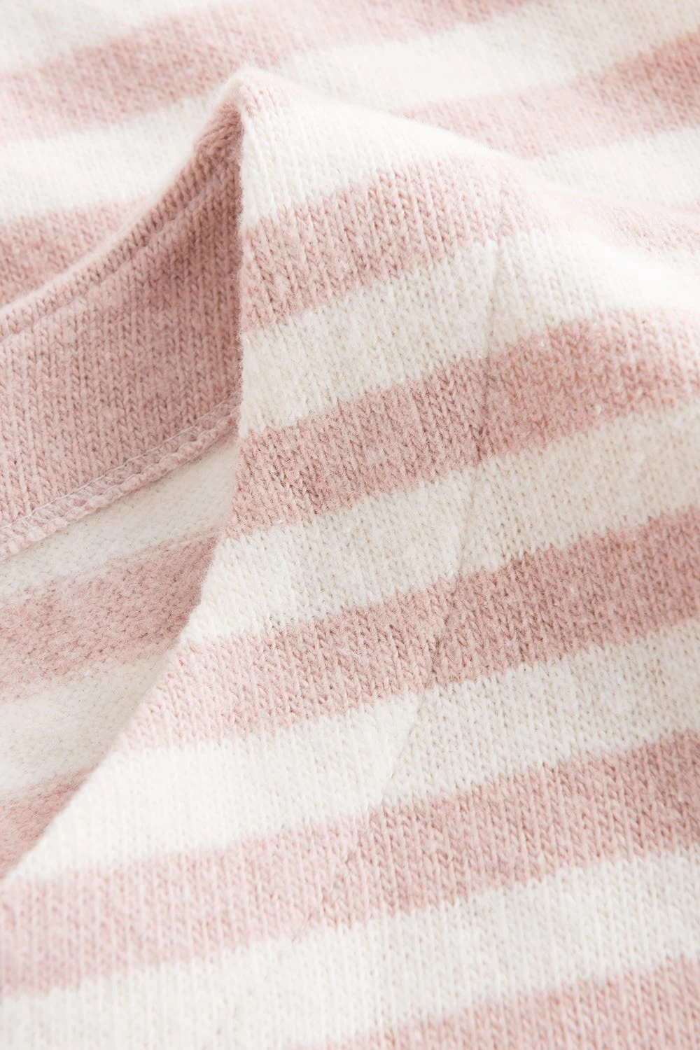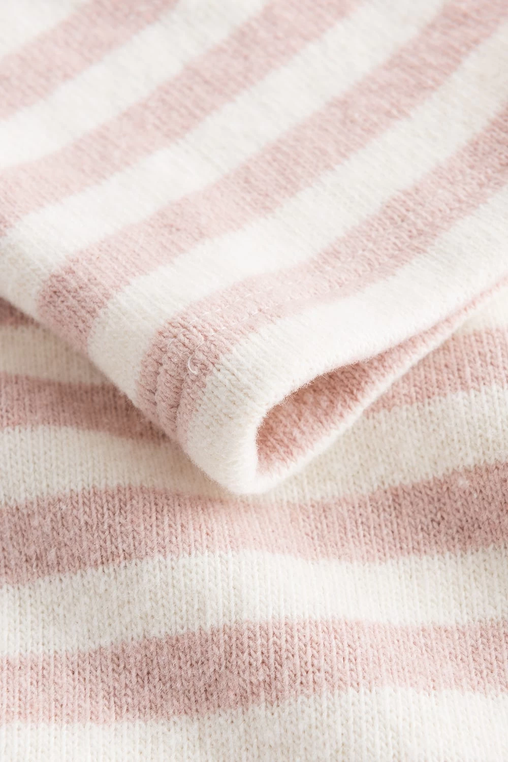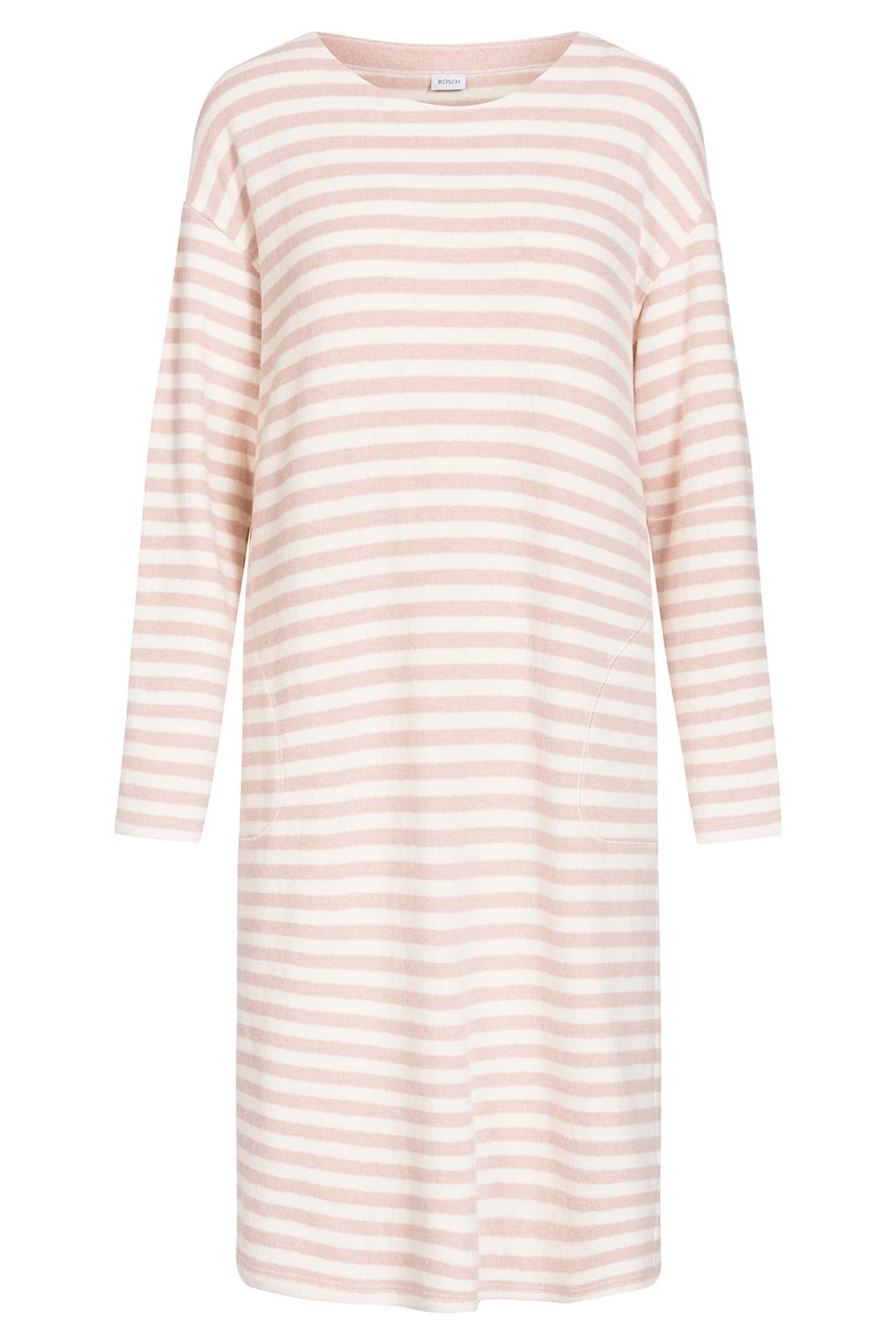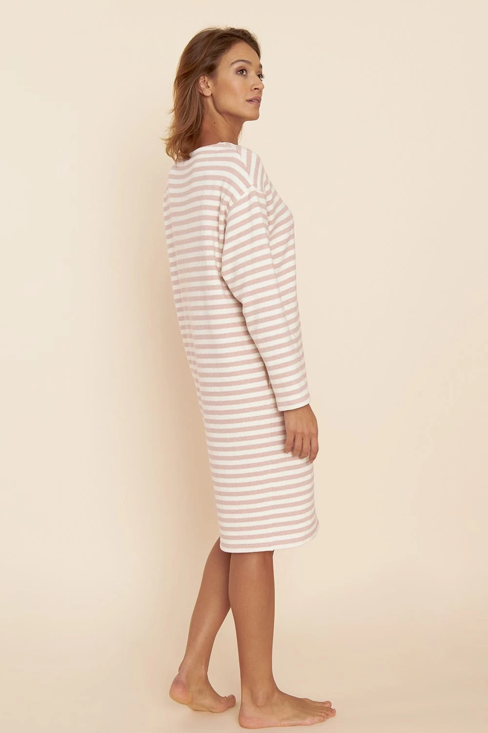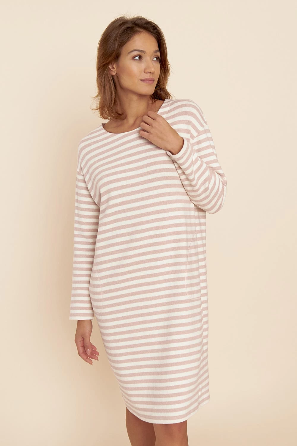 Kuscheliges Nachtkleid aus geringeltem Strickstoff und seitlichen Taschen. Das Modell ist lässig geschnitten.