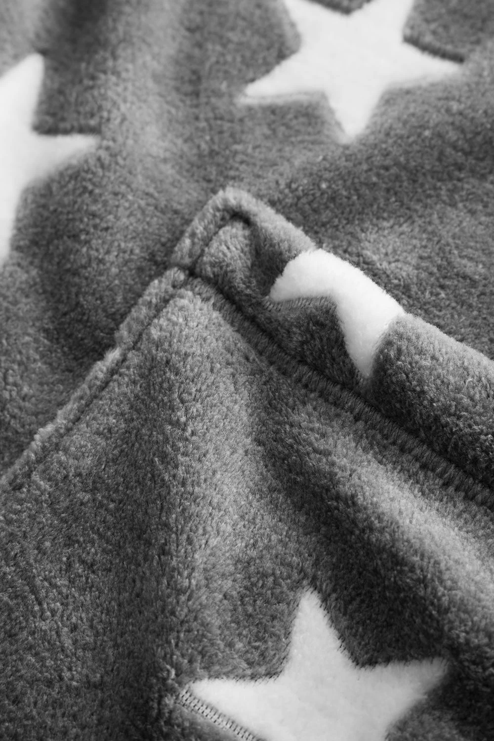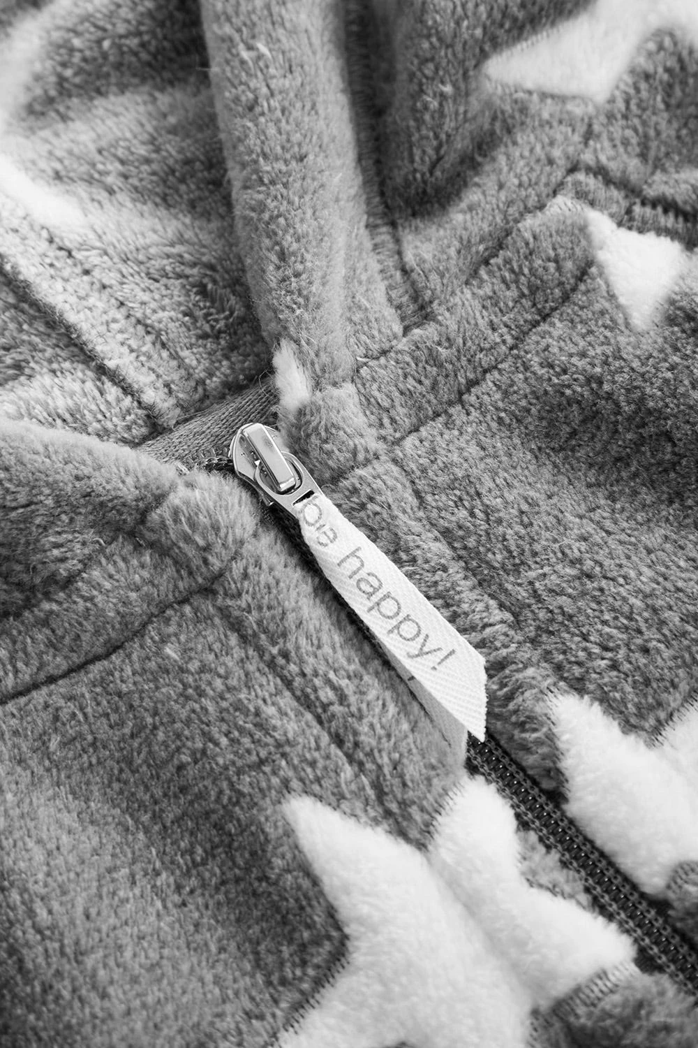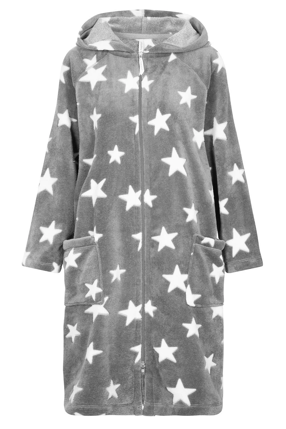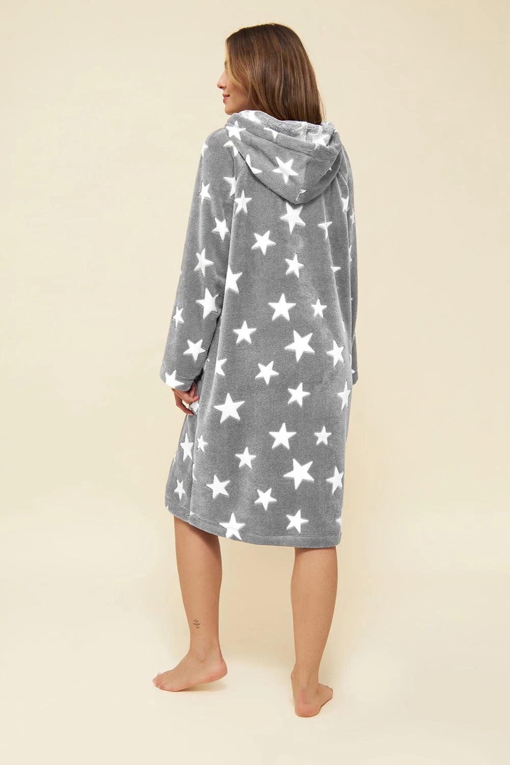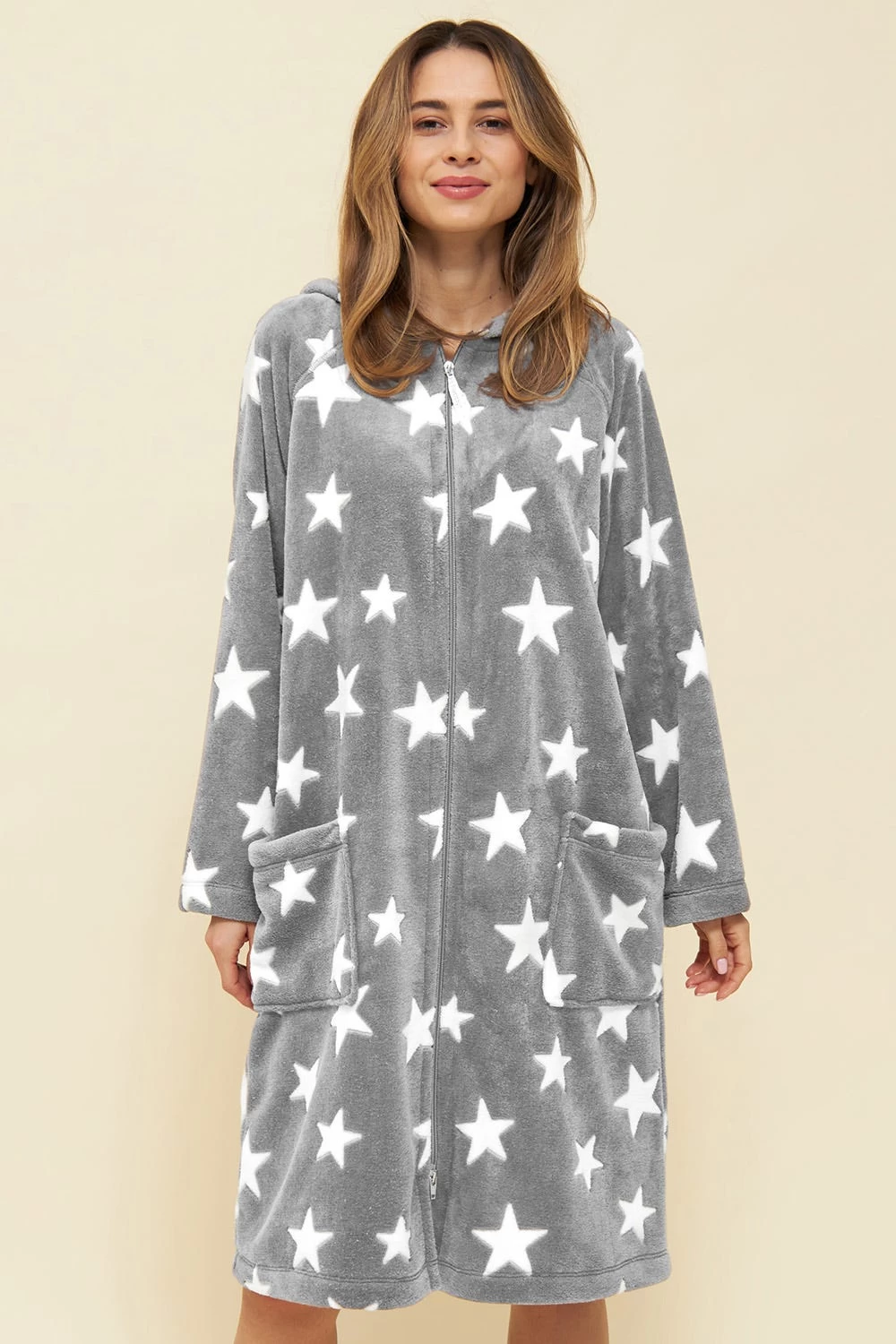 Kuscheliger Plüschmantel mit Kapuze. Der Mantel hat einen Reißverschluss und aufgesetzte Taschen.