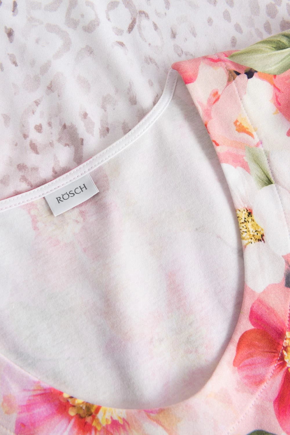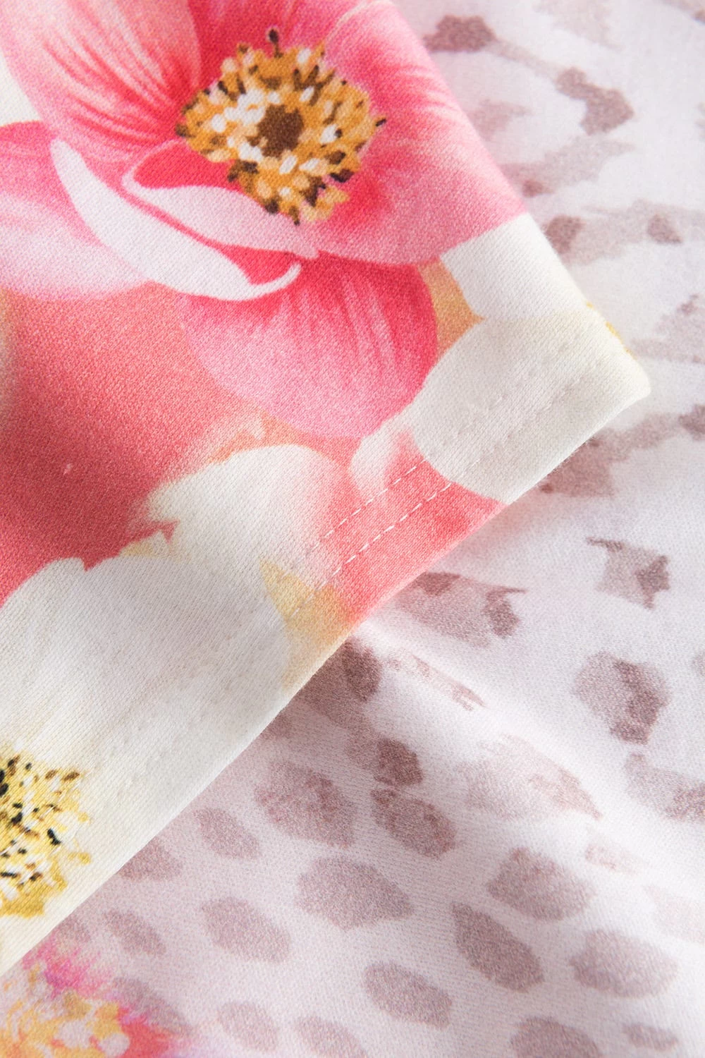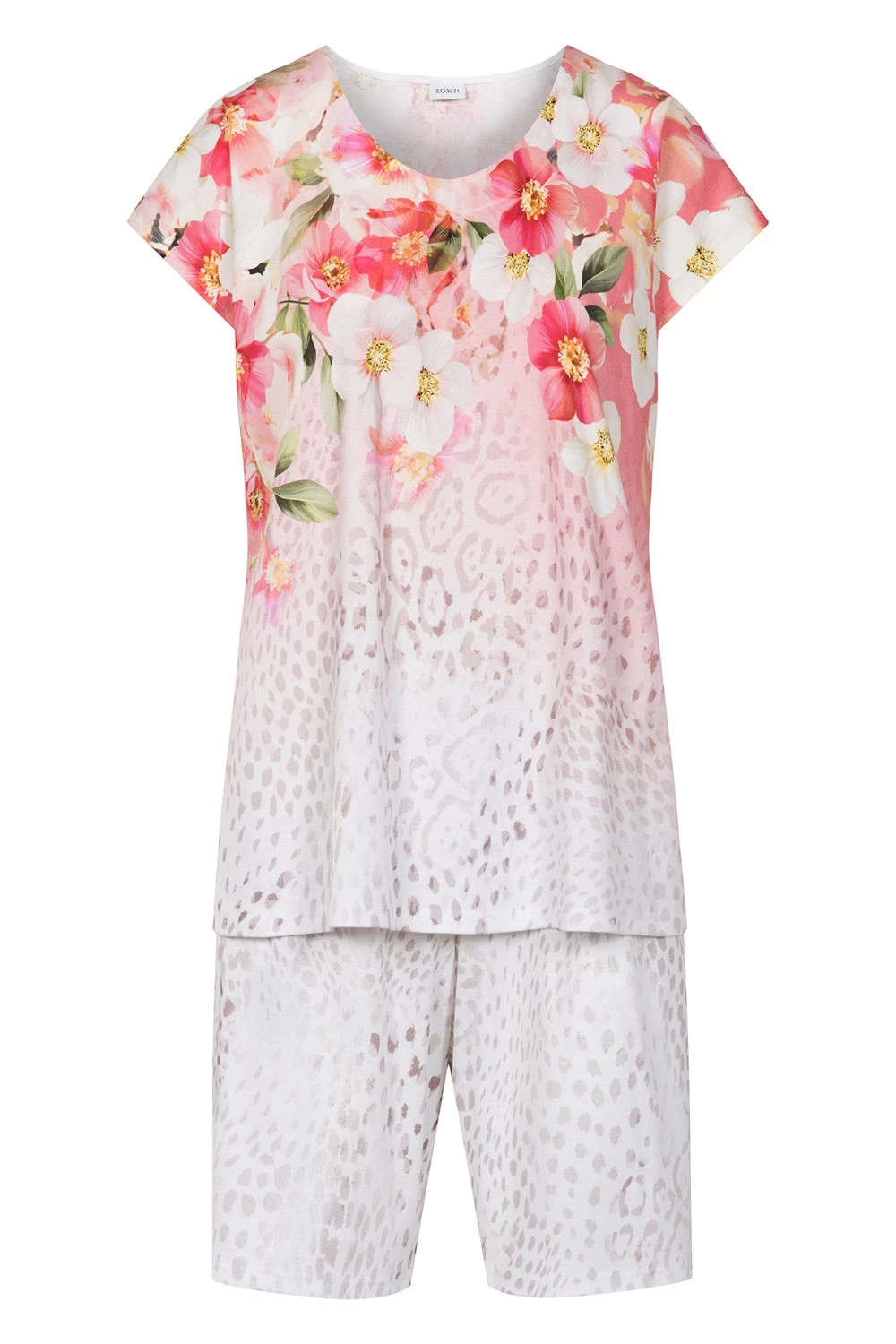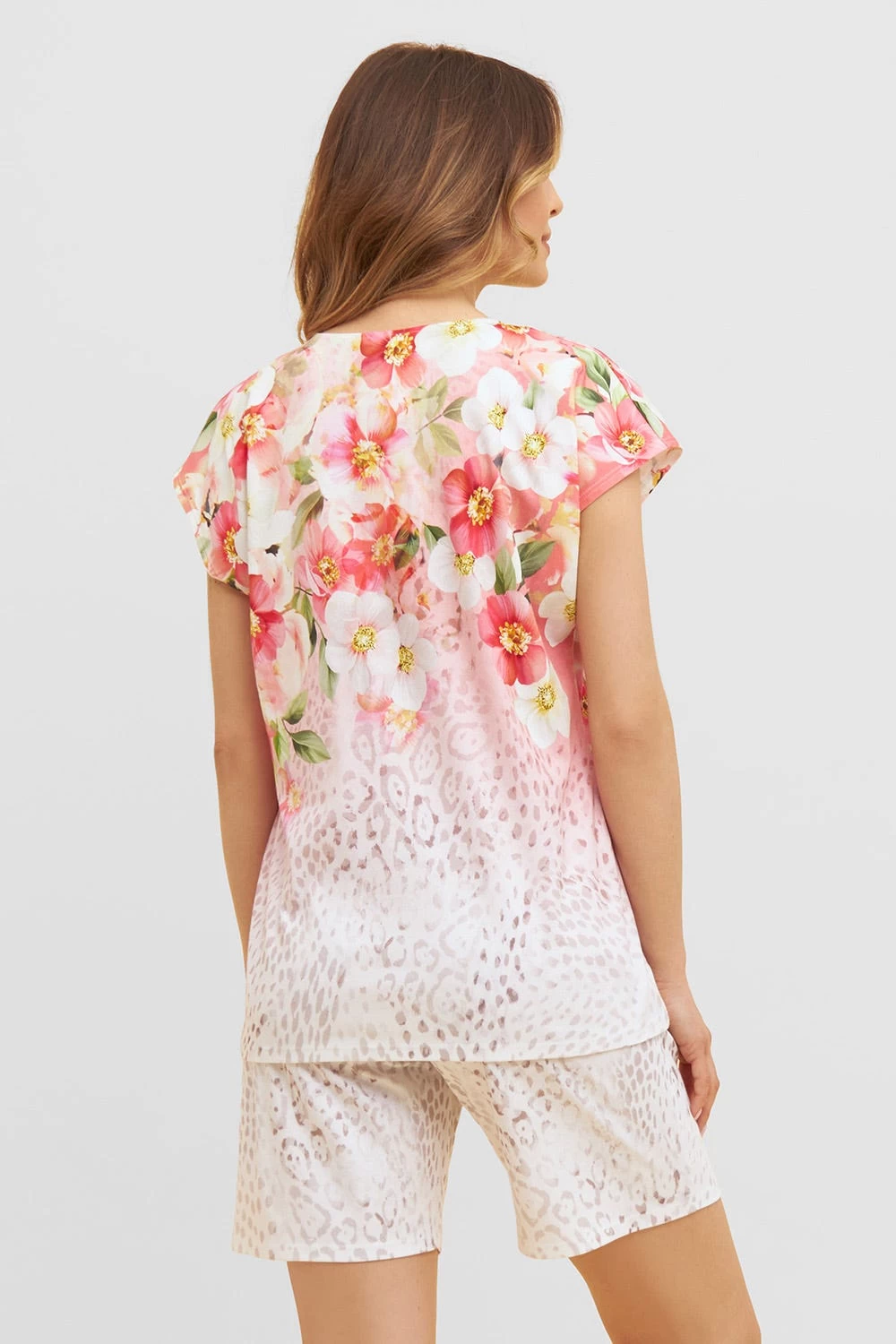 Romantischer Pyjama aus Bermuda und T-Shirt mit platziertem Blumendruck auf Leo-Muster. Der Schlafanzug hat einen Rundhals, überschnittene Schultern und eine Hose mit Gummibund.