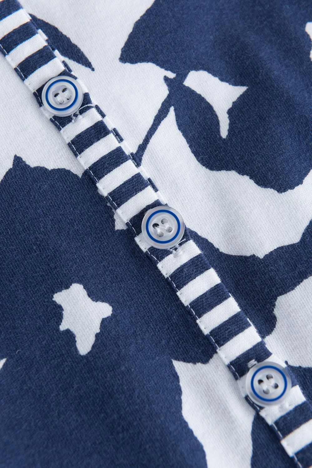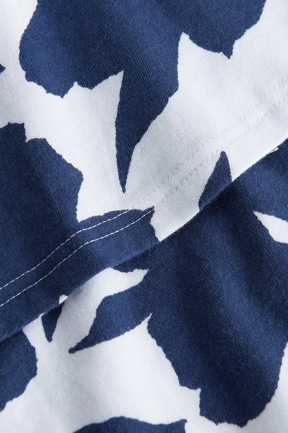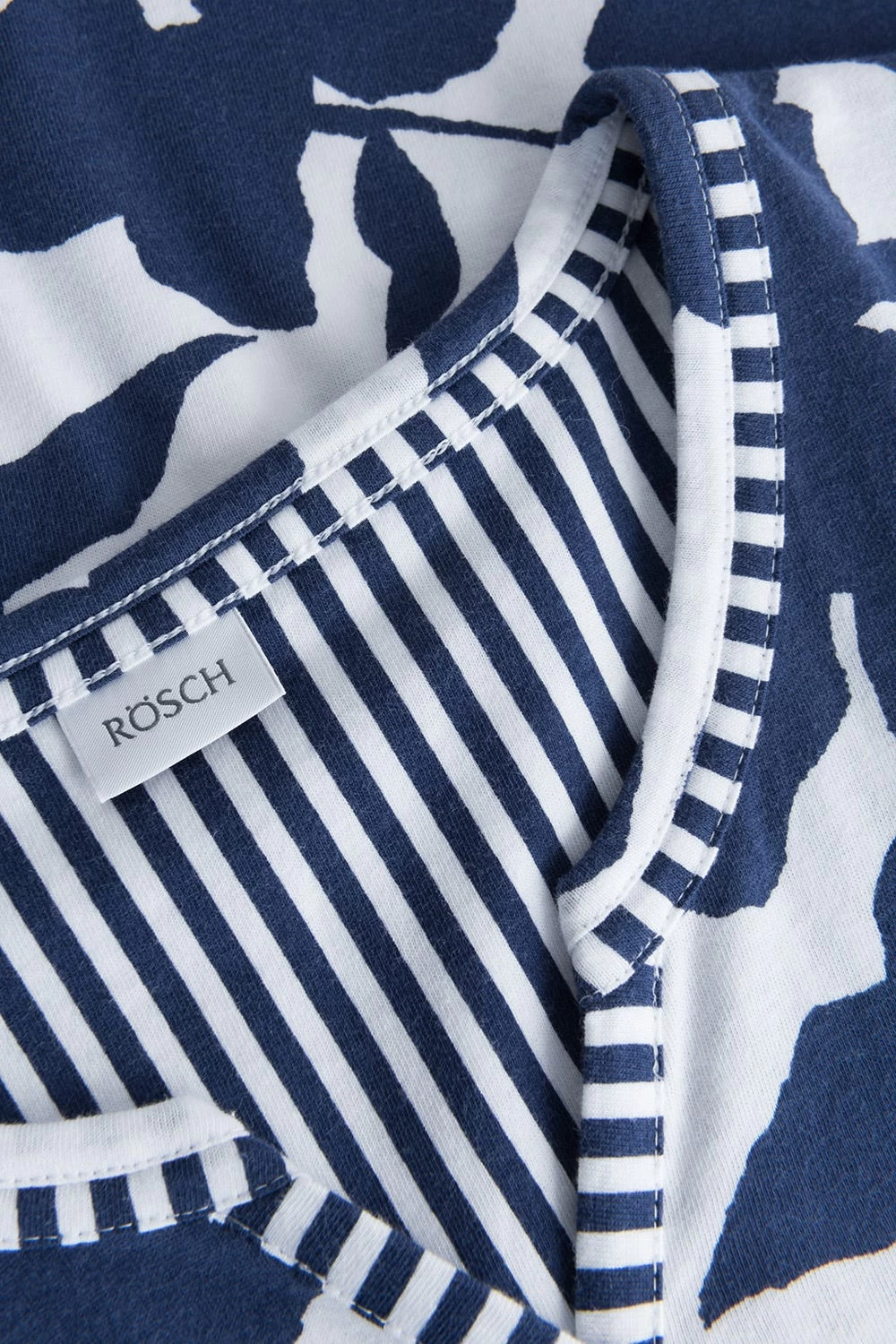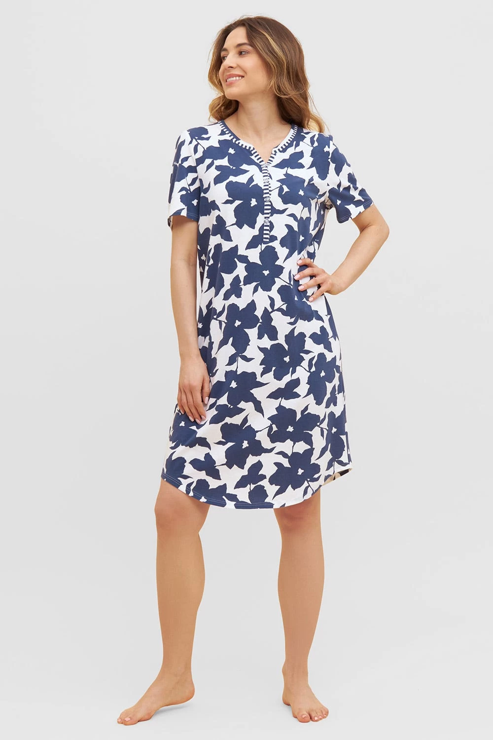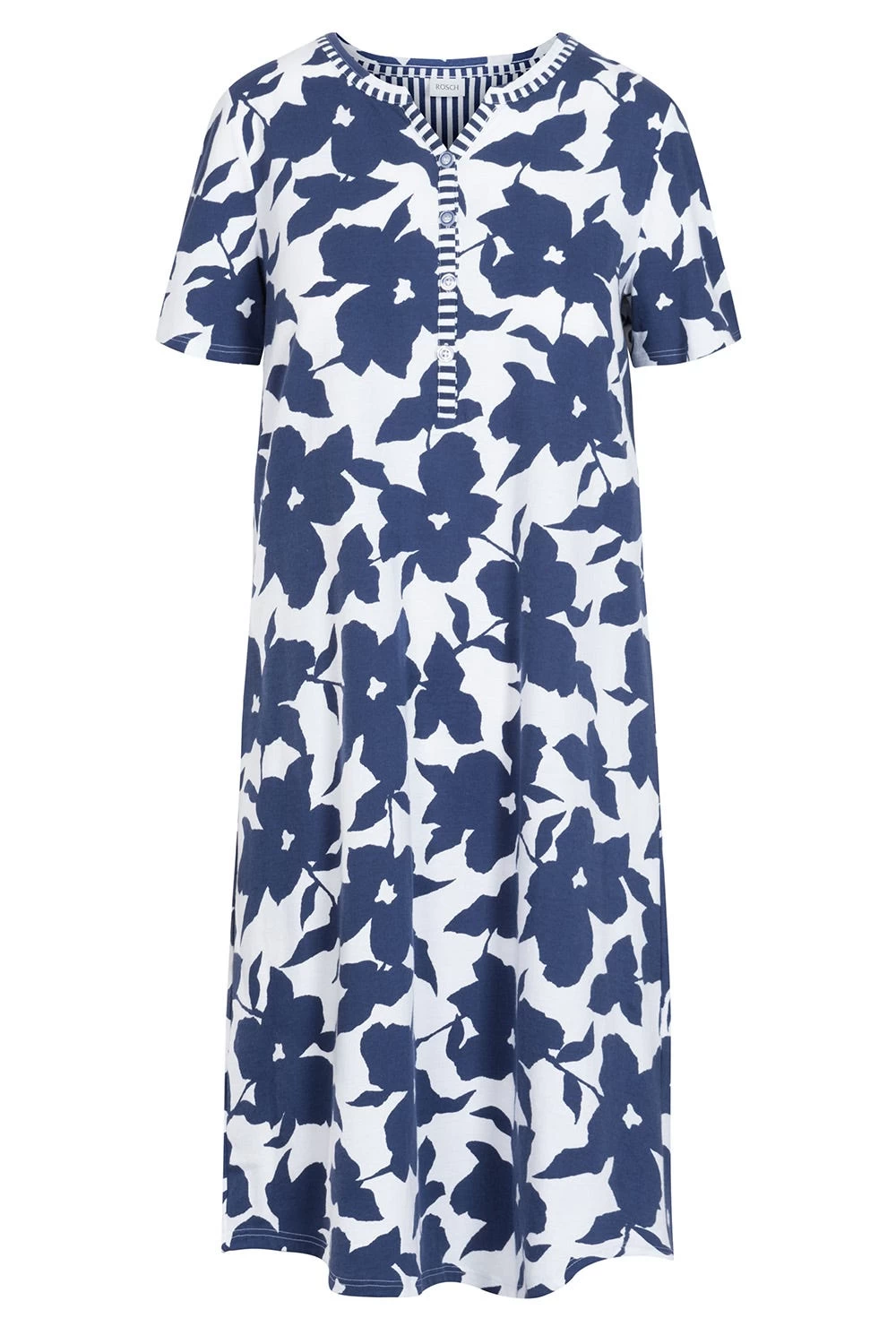 Nachthemd mit kurzen Ärmeln und halber Knopfleiste am Ausschnitt. Der Rundhals und die Knopfleiste sind im Streifen-Druck, das Kleid im schlichten Blumen-Druck.