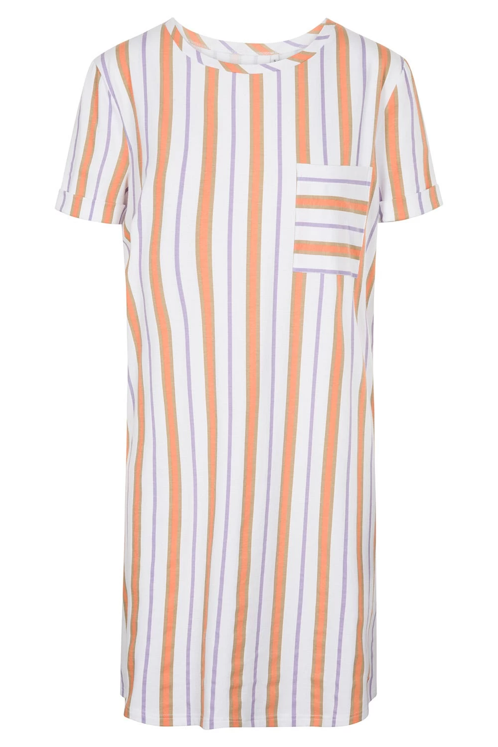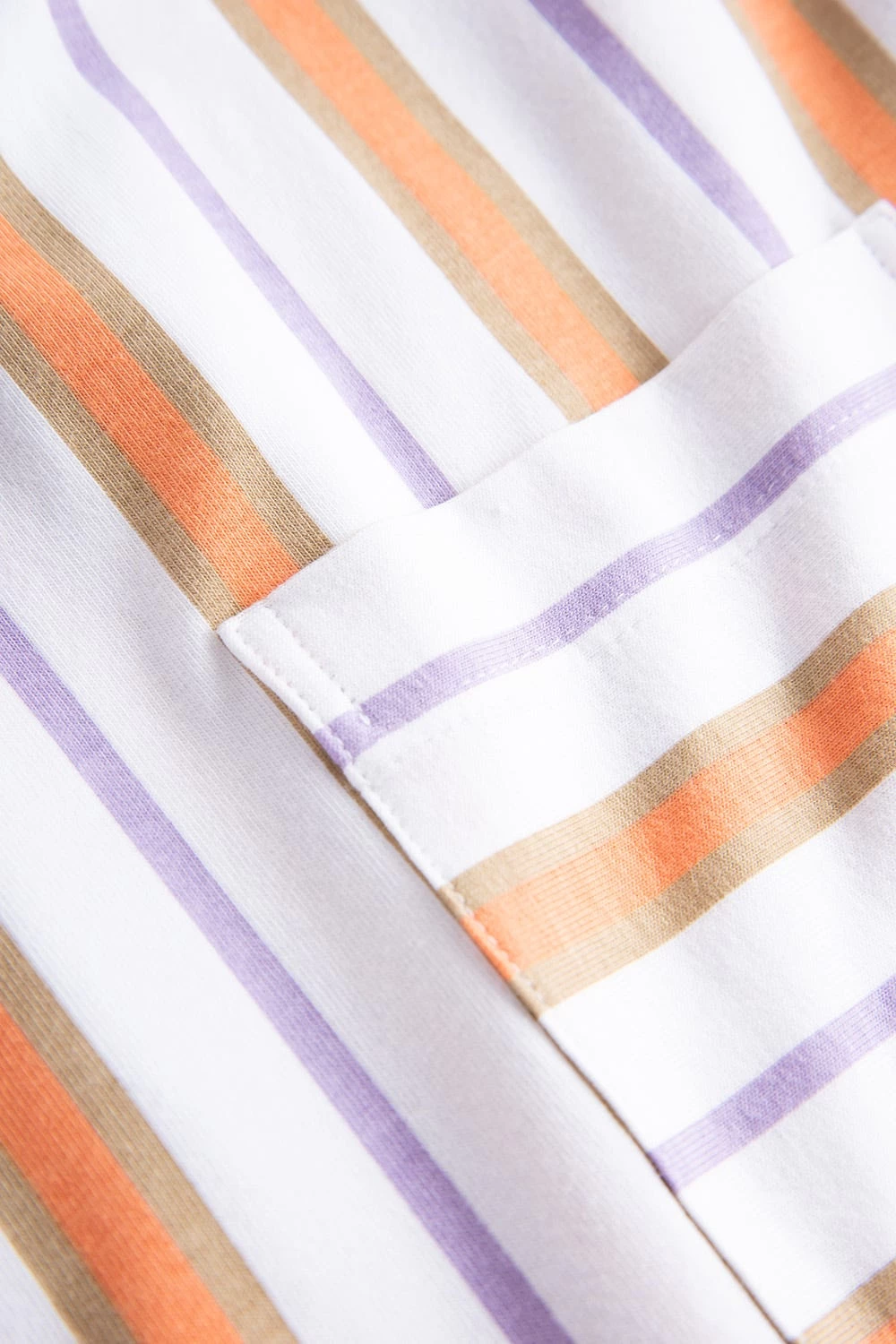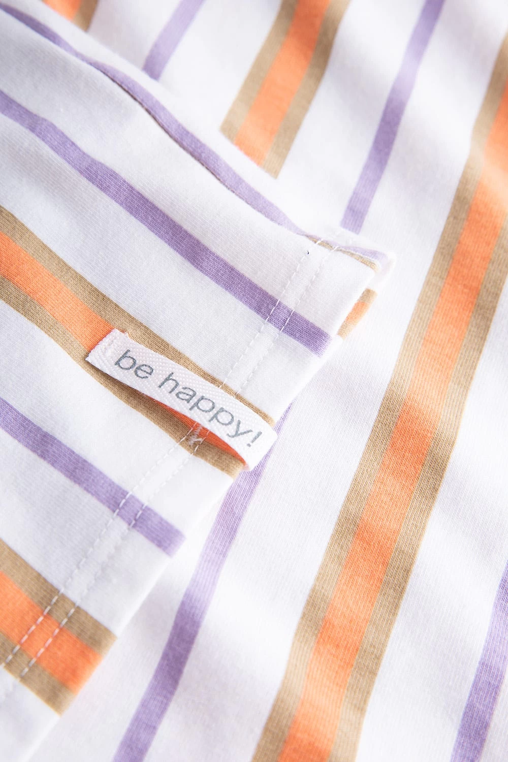 Das Design in Streifendruck besteht aus Baumwolle und Elasthan. Das locker geschnittene Kleid besitzt Ärmel mit Aufschlag sowie einen modernen Rundhals und eine Brusttasche.