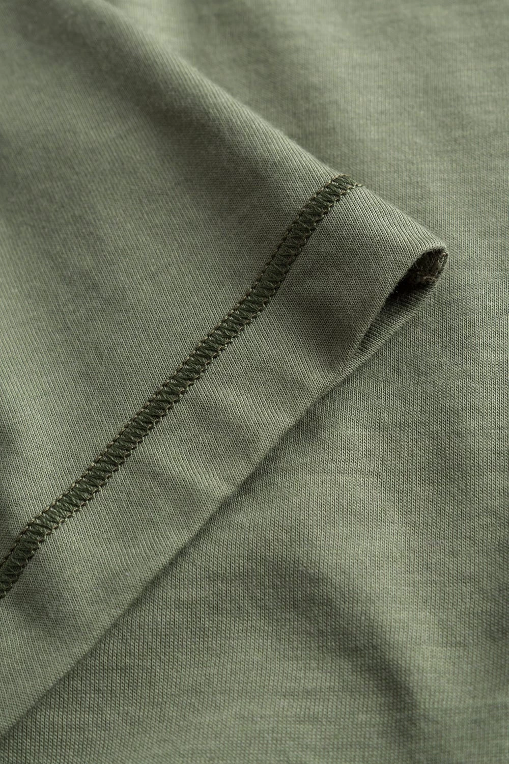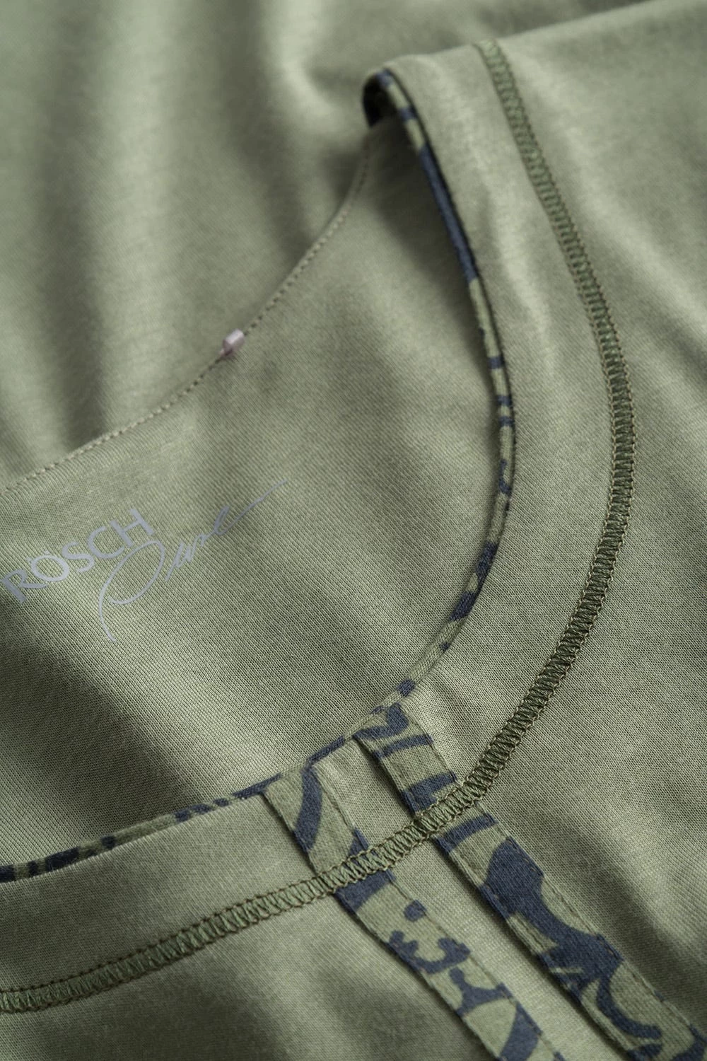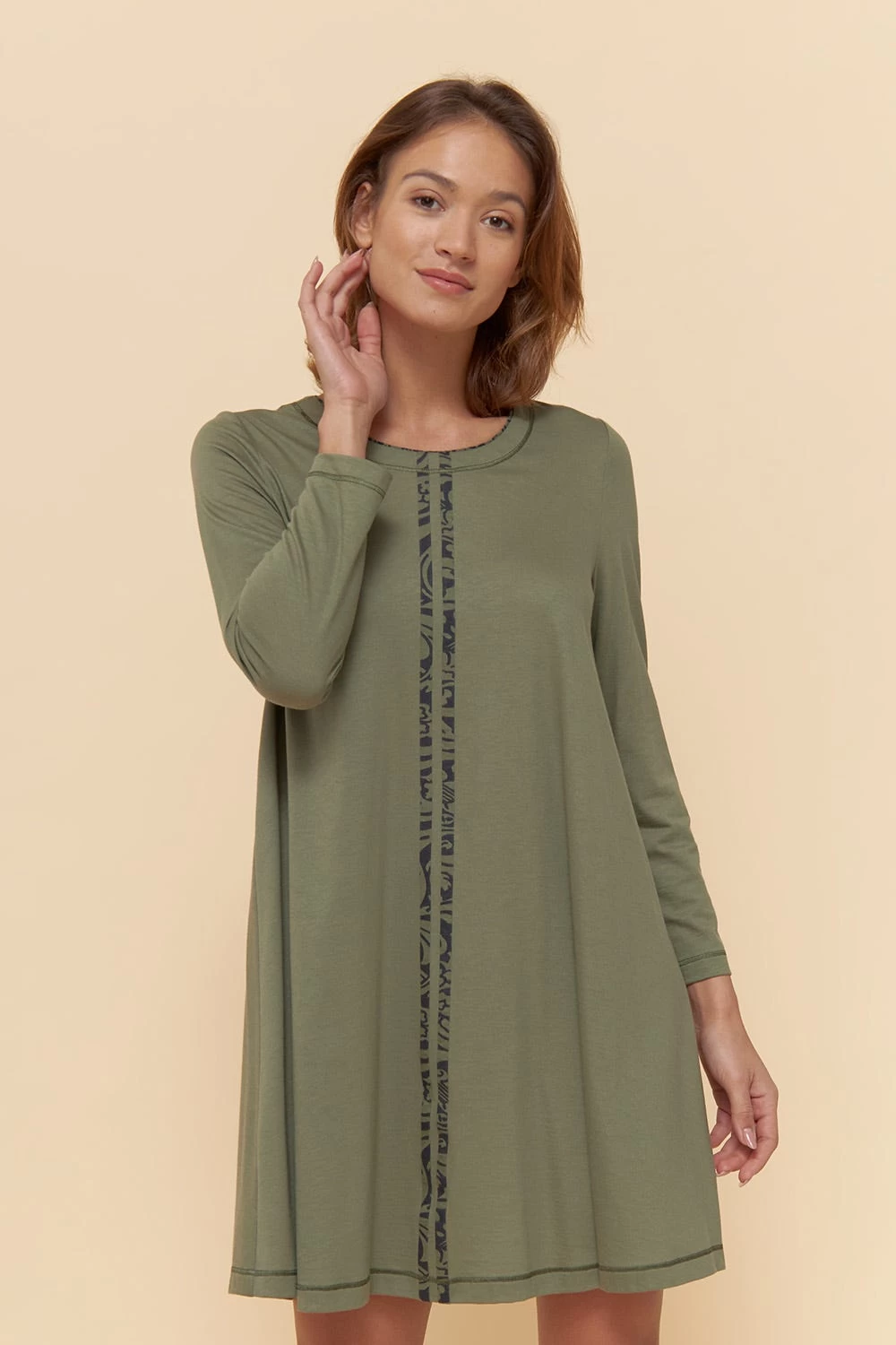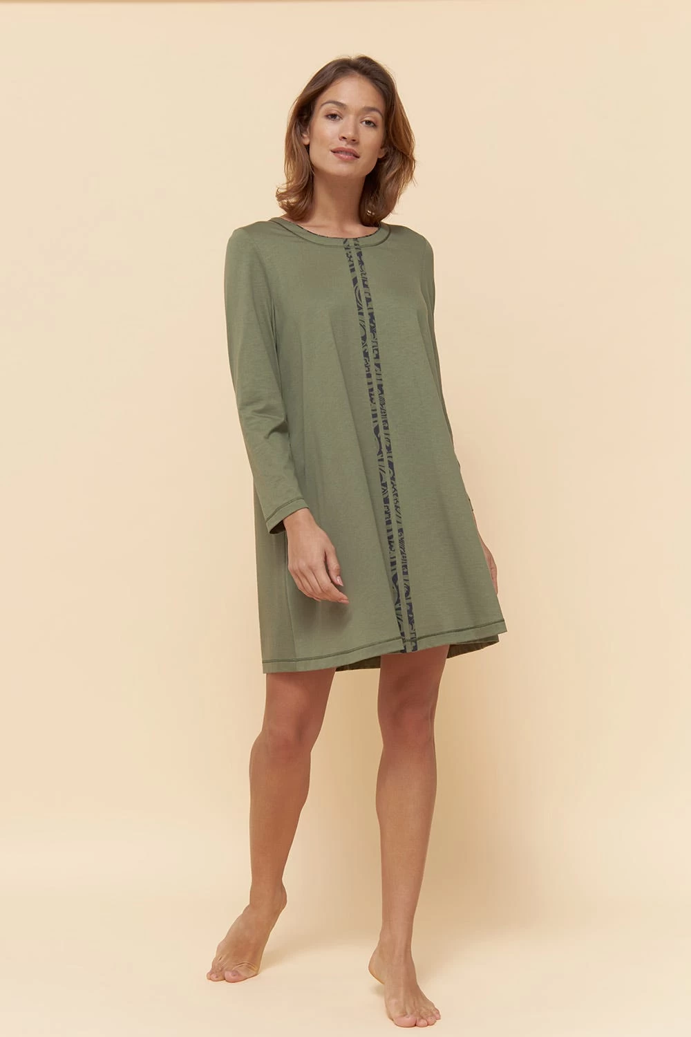 Nachthemd mit leicht aufgedrehtem Saum. Der Rundhals ist mit kleiner Paspel verarbeitet. In vorderer Mitte sind zwei schmale Bänder aus Druckstoff aufgenäht, die für eine charmante Linie sorgen.