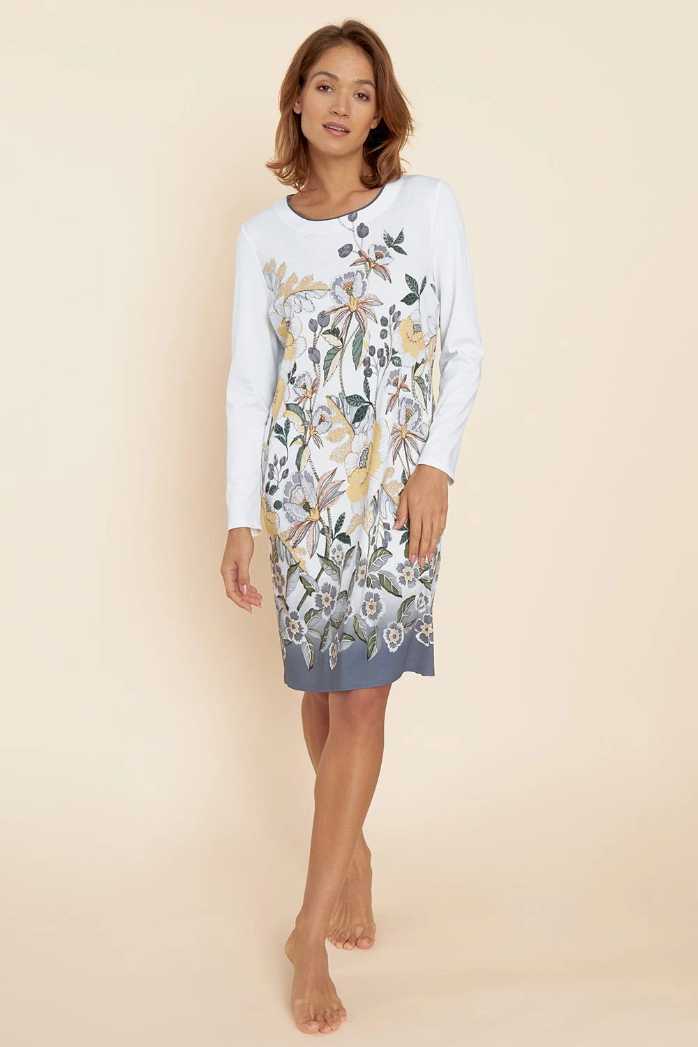 Nachthemd mit platziertem Druck auf weichem Jersey-Interlock. Das Halsloch ist mit Paspel in Uni an der Kante eingenäht und mit Beleg gearbeitet.