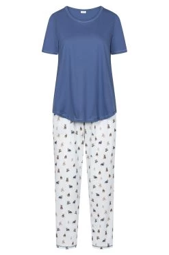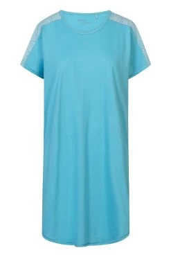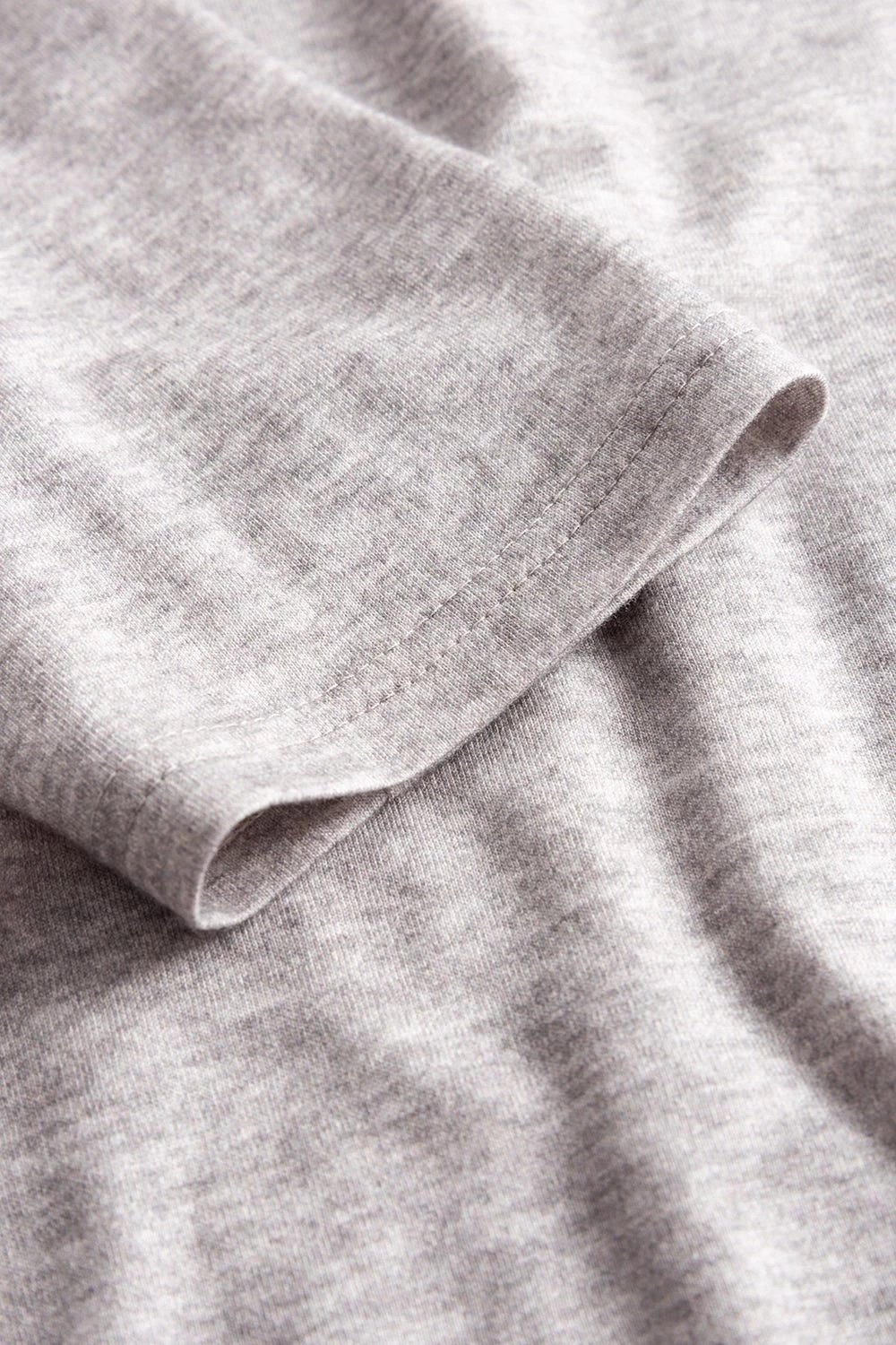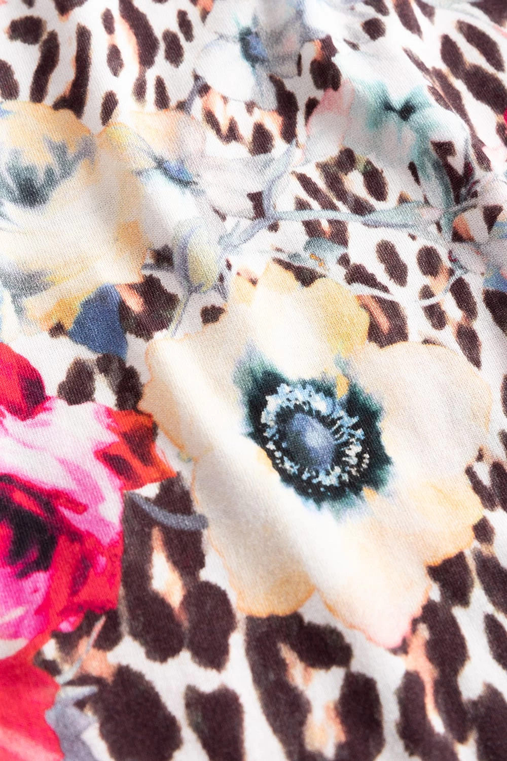 Nachthemd mit modernem, platziertem Druck. Der Druck ist interessant gemixt aus Melangeoptik und Leodruck mit Blüten. Der Rundhals hat eine kleine Paspel aus Leodruck.