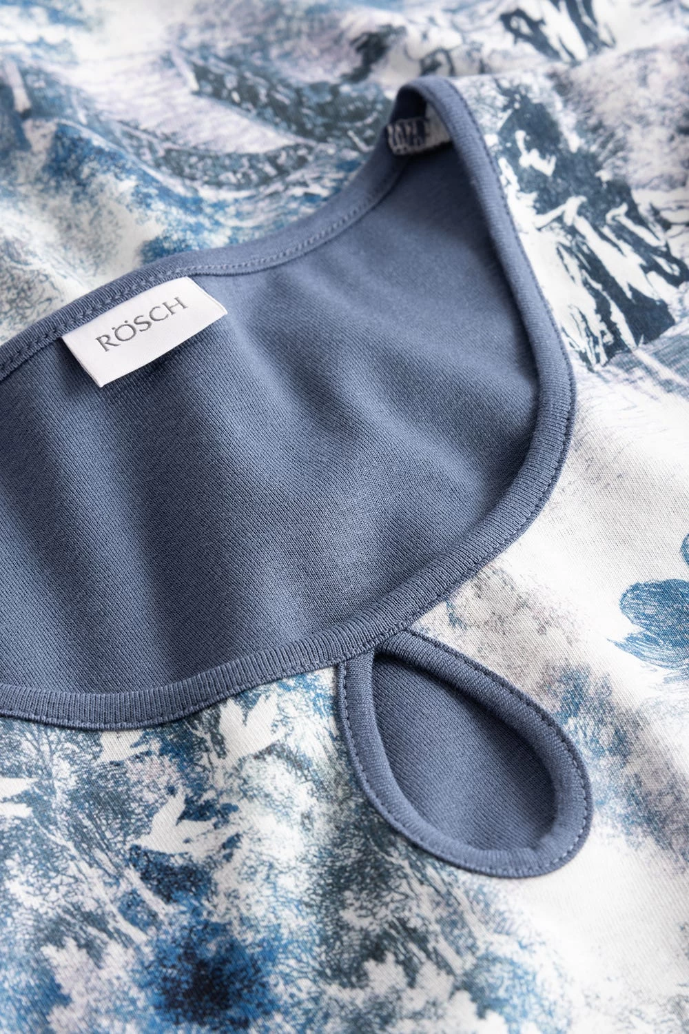 Nachthemd aus bedrucktem, weichen Jersey. Das Muster erinnert an die klassischen Toile de Jouy Drucke. Das Halsloch ist in Uni passend eingefasst und hat ein kleines, ebenfalls eingefasstes Loch in der vorderen Mitte. Der Saum ist leicht abgerundet.