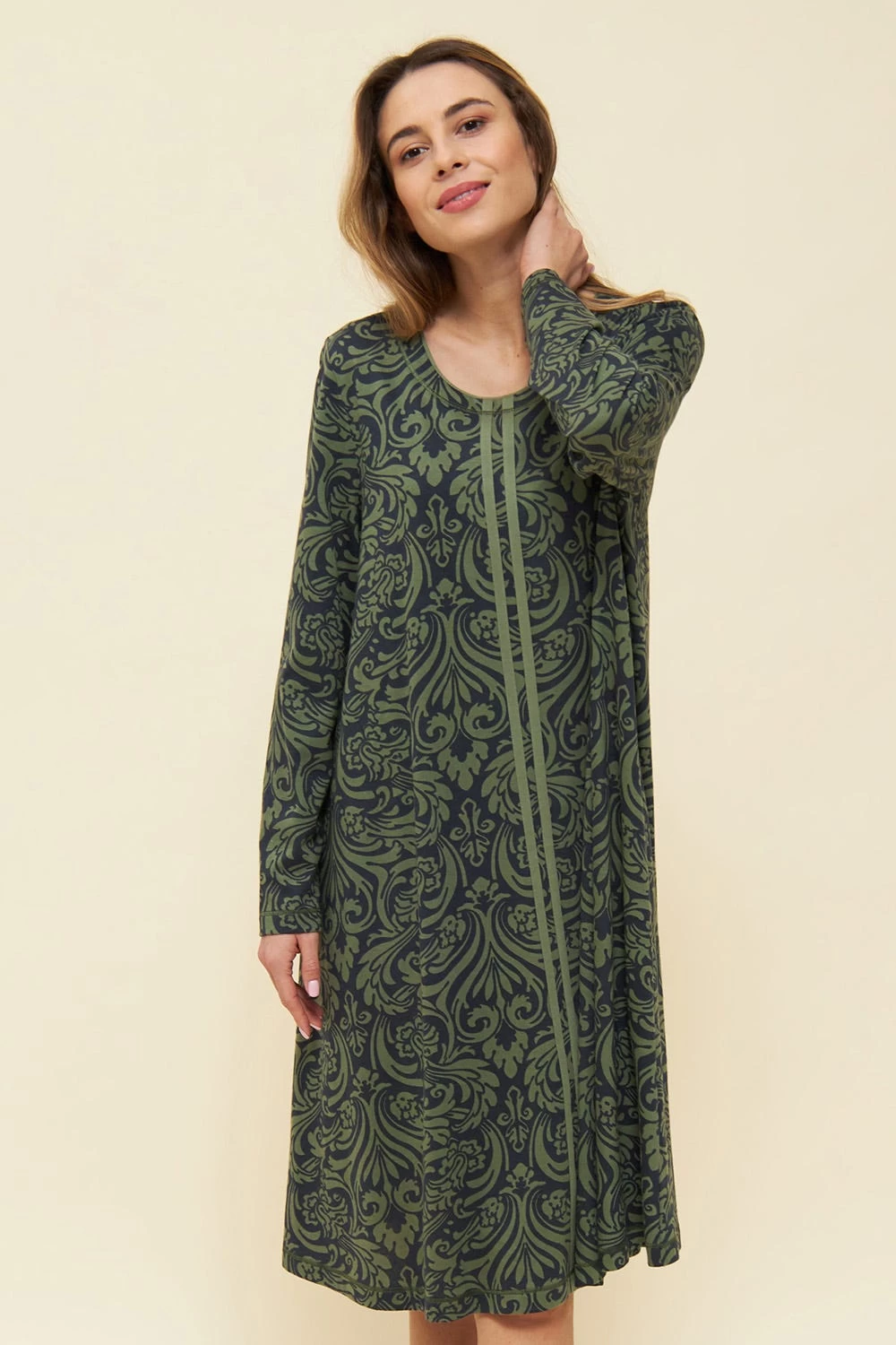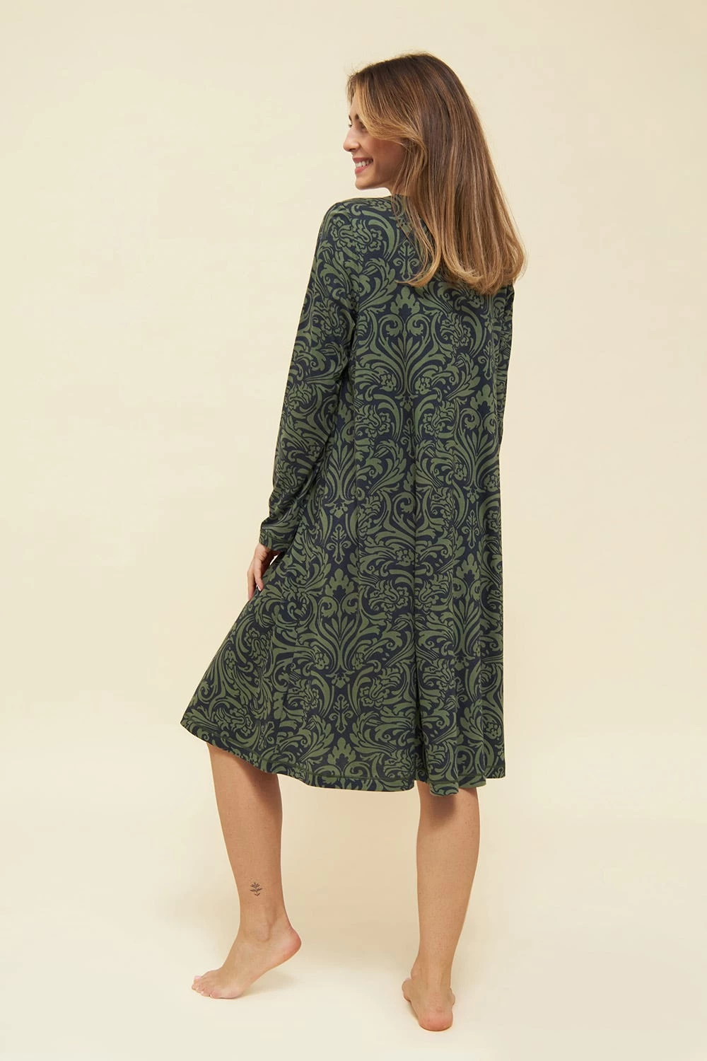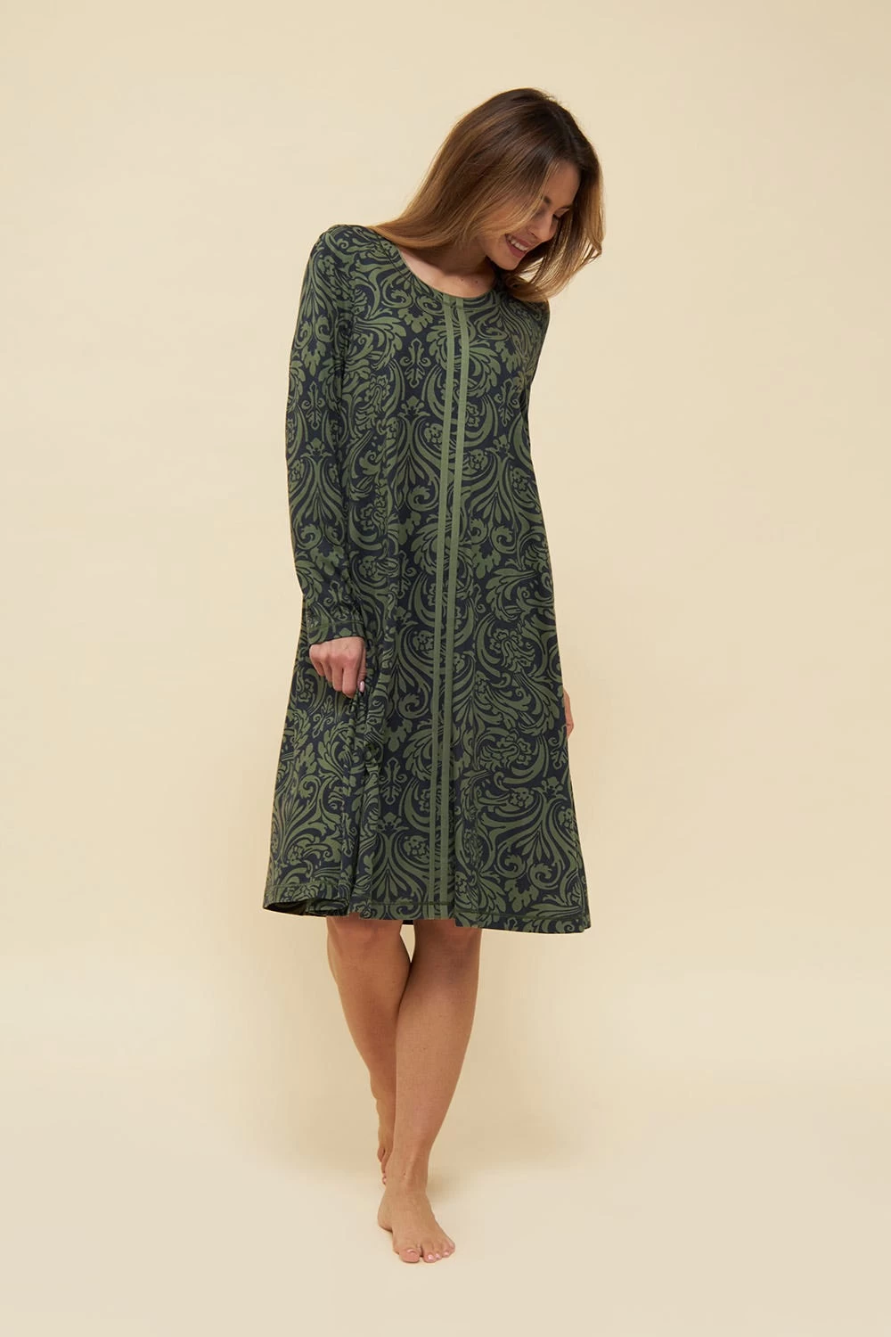 Bedrucktes Nachtkleid mit leicht aufgedrehtem Saum. Der Rundhals ist mit kleiner Paspel verarbeitet. In vorderer Mitte sind zwei schmale Bänder aufgenäht, die für eine charmante Linie sorgen.