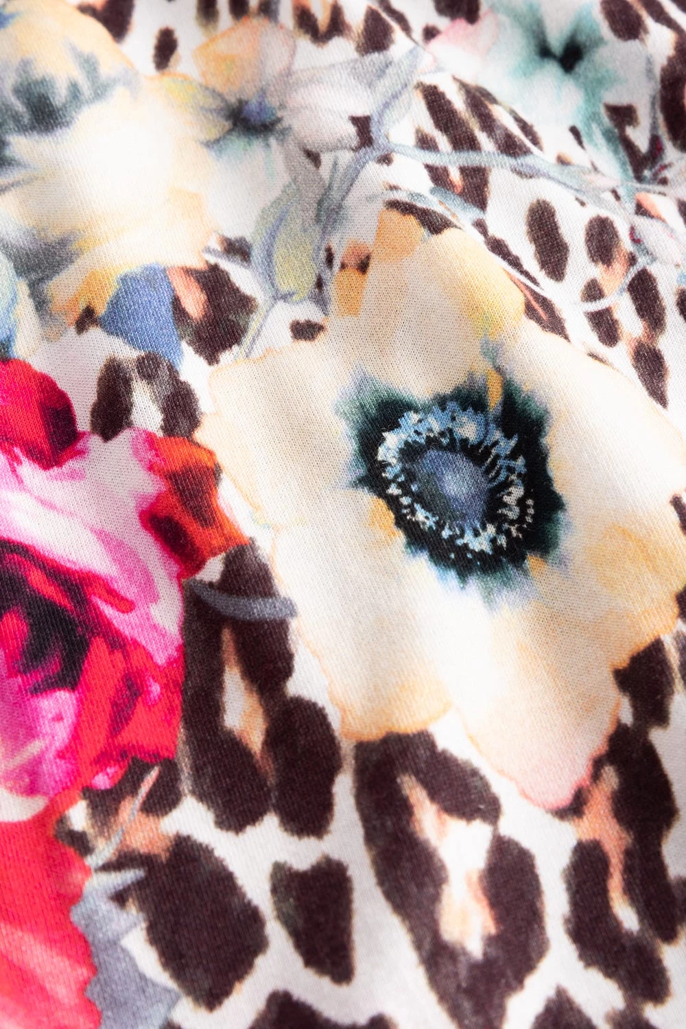 Nachtkleid mit modernem, platziertem Druck. Der Druck ist interessant gemixt aus Melangeoptik und Leodruck mit Blüten. Der Rundhals hat eine kleine Paspel aus Leodruck. Die seitlichen Schlitze sorgen für Bequemlichkeit.