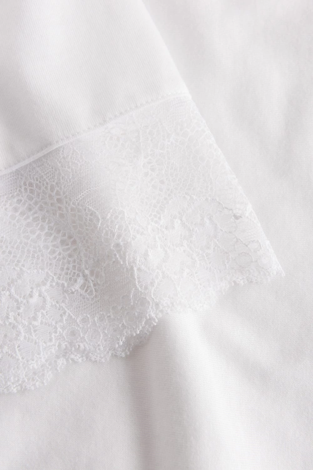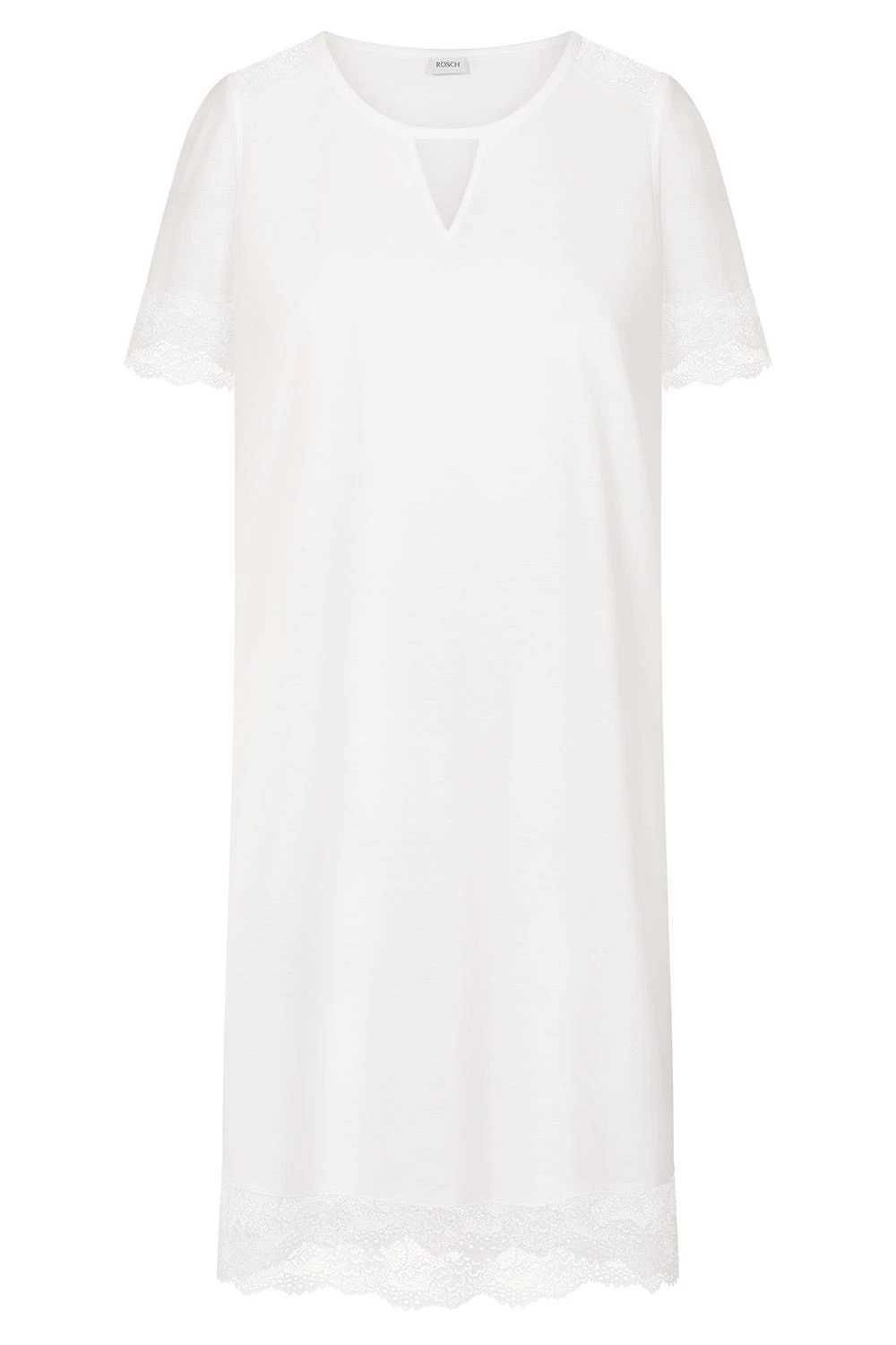 Das Nachtkleid in Uni schmückt sich mit eleganten Spitzendetails an den Schultern und am Ärmel- und Kleidsaum. Der raffinierte Ausschnitt mit Schlitz macht das Nachthemd besonders edel.
