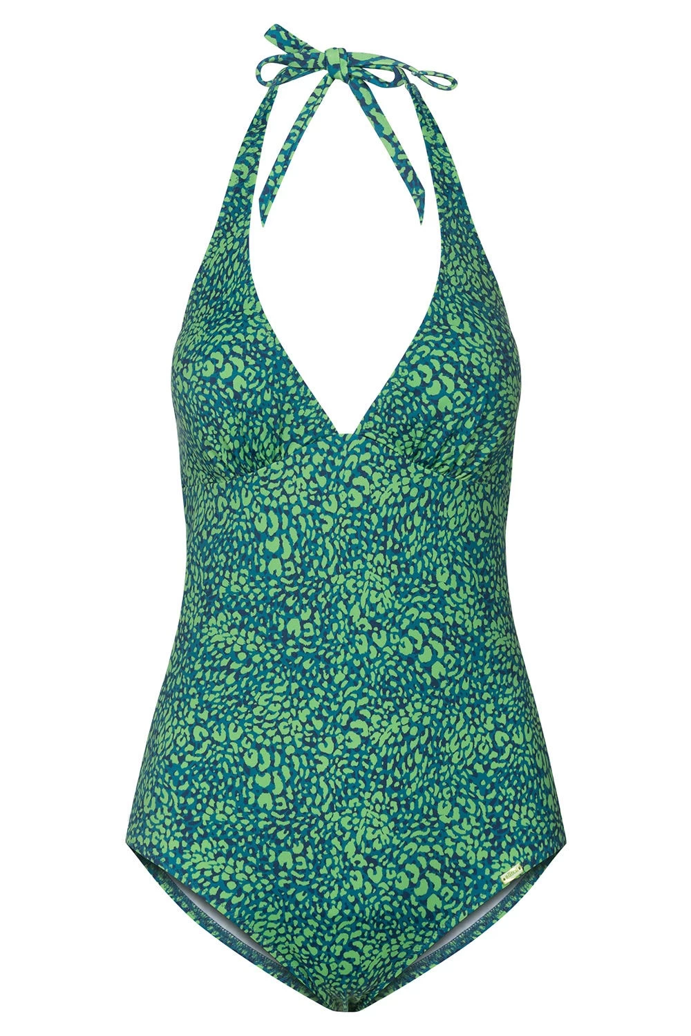 Der minimale Leo-Druck definiert diesen Neckholder-Badeanzug. Das Modell besitzt Spacer-Cups. Zudem können die Träger auf verschiedene Möglichkeiten gebunden bzw. getragen werden.
