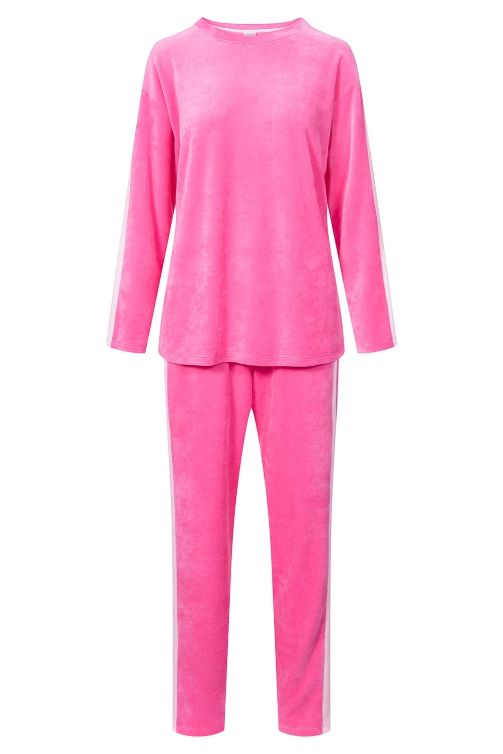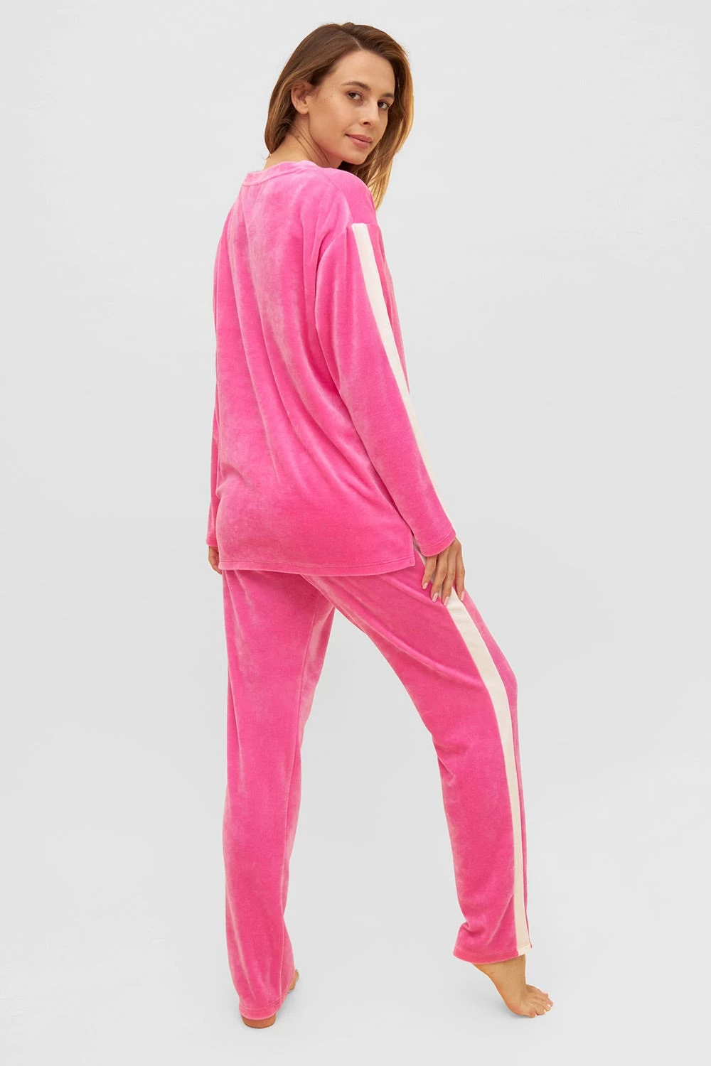 Moderner Hausanzug aus kuscheligem Nicki mit dekorativen Kontraststreifen. Der Gummibund der Hose, die Hosentaschen und die kurzen Schlitze am Pulloversaum sorgen für Bequemlichkeit. Das kuschelige Material ist perfekt für die kalten Wintermonate und hält besonders warm.