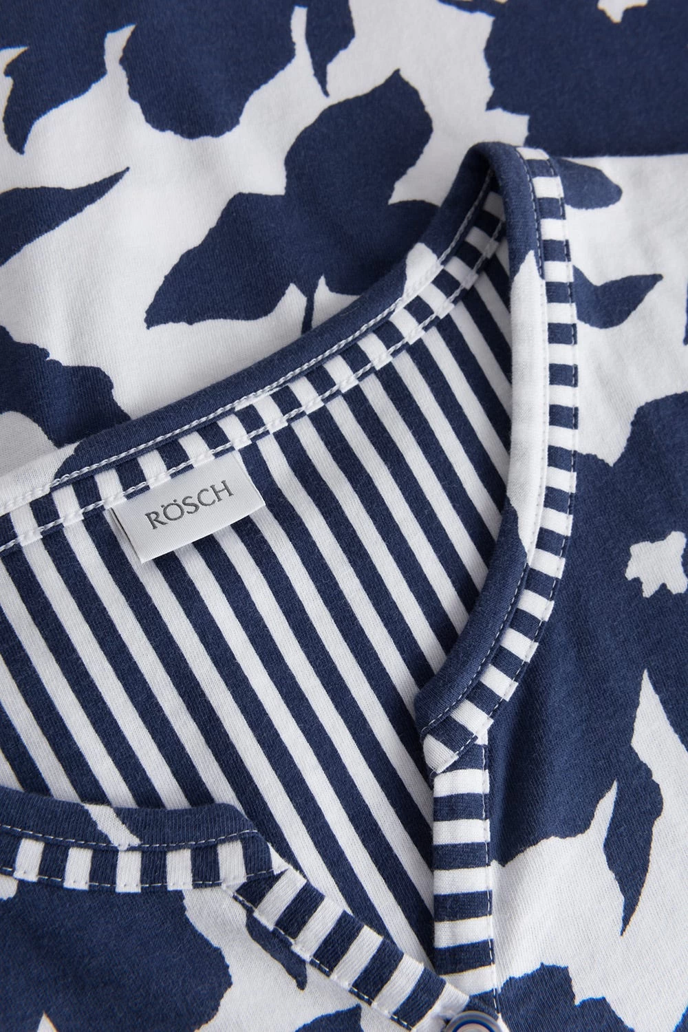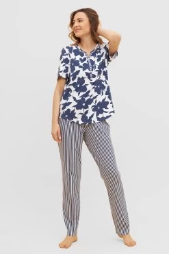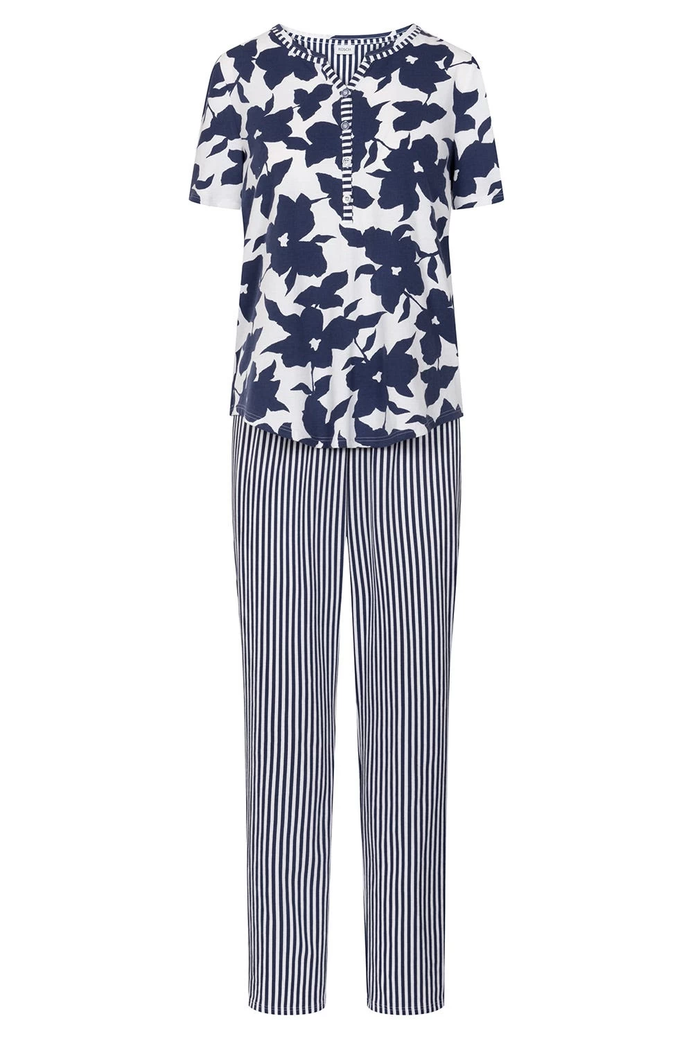 Pyjama mit kurzen Ärmeln und halber Knopfleiste am Ausschnitt. Der Rundhals und die Hose mit angenehmen Gummibund sind im Streifen-Druck, das Oberteil im schlichten Blumen-Druck.