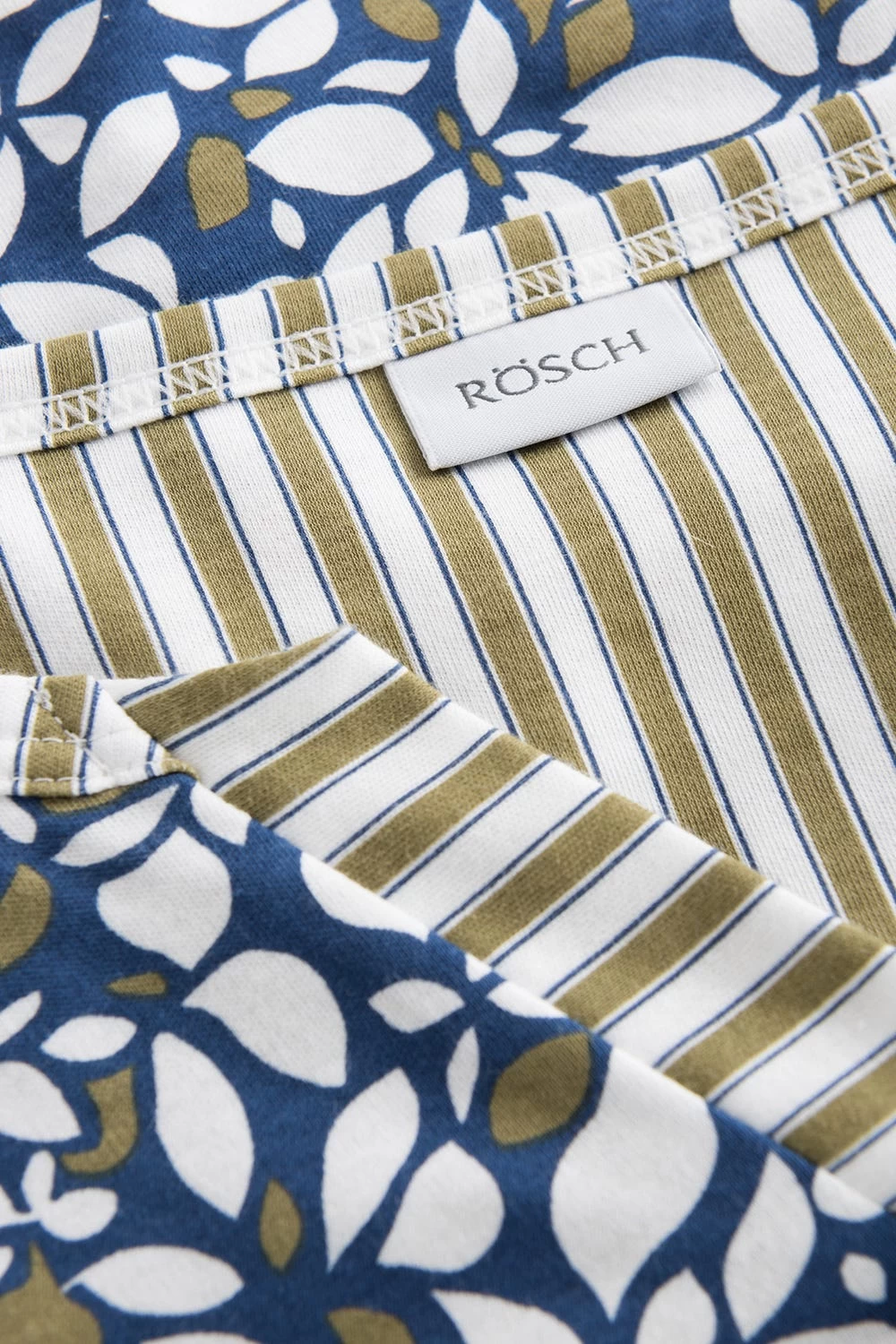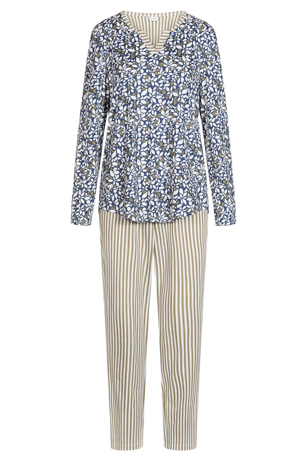 Pyjama aus zwei Drucken, die im Mix verarbeitet sind. Am Oberteil ist ein Schlitz mit Beleg am Halsloch und ein Einfassband im Druckmix verarbeitet. Die Hose ist aus Druckstoff und gerade geschnitten.