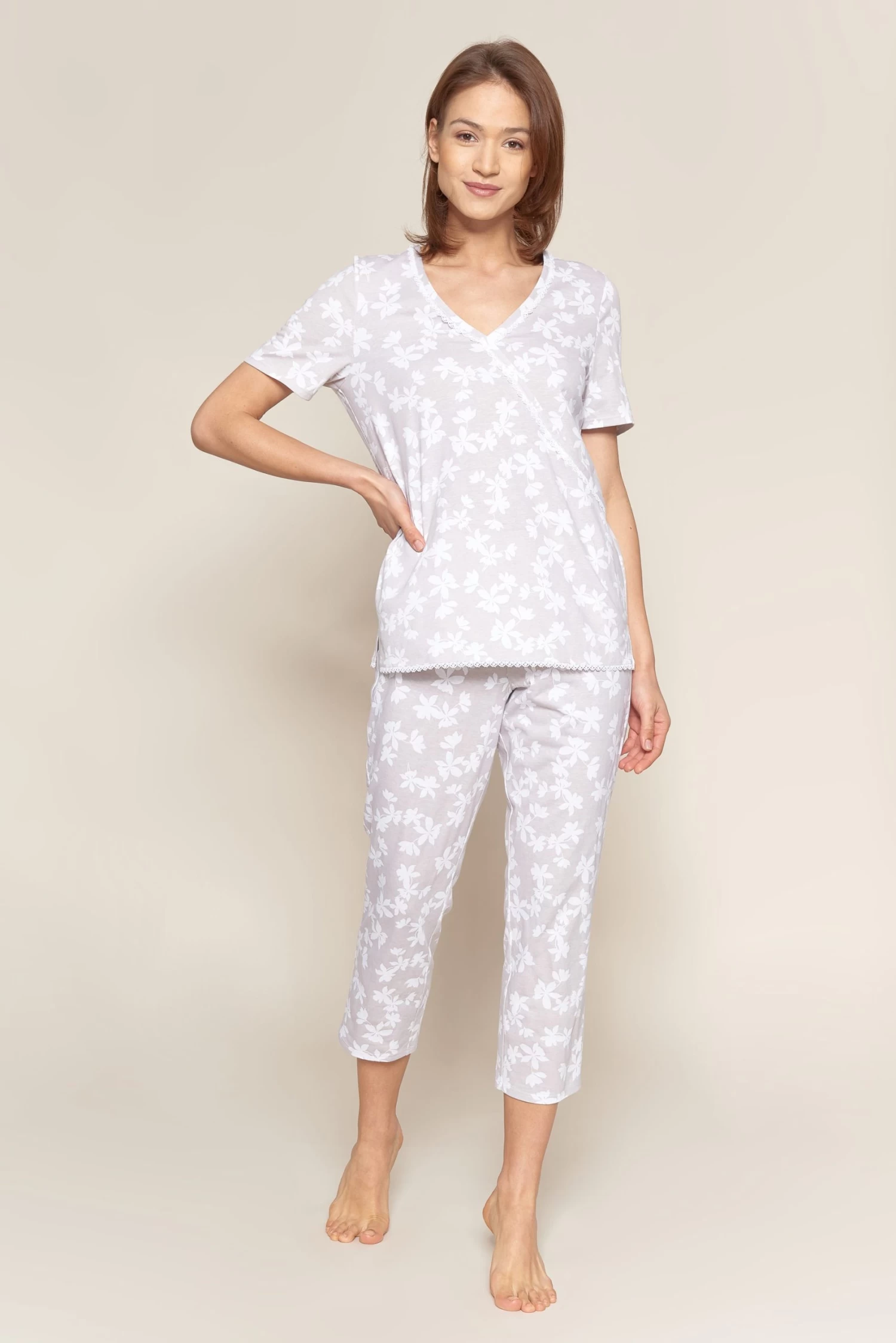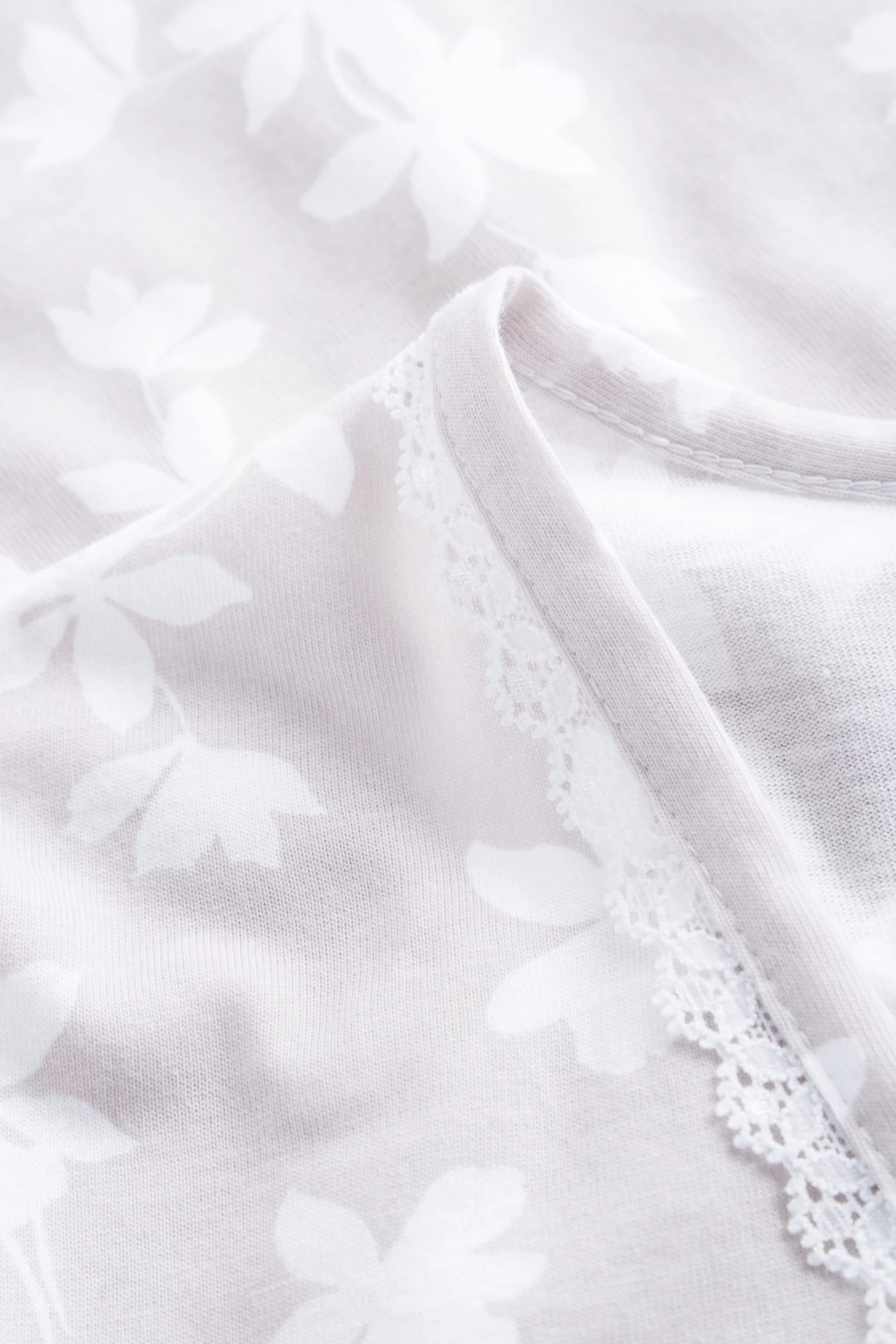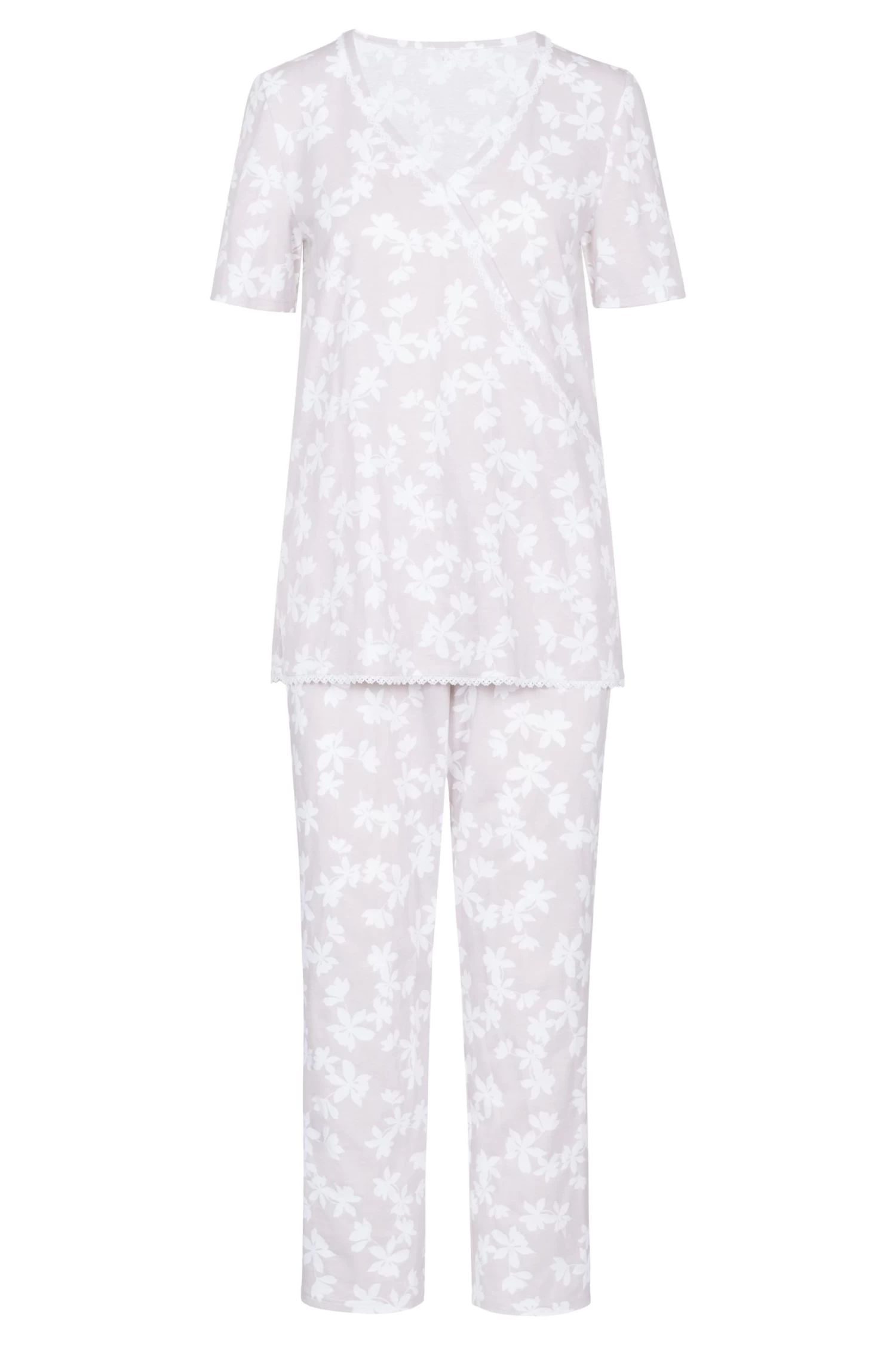Pyjama mit Wickeloptik am Oberteil. Die elastische, weiße Spitze am Ausschnitt, der Teilungsnaht und am Saum unterstreicht die interessante Linienführung. Seitliche, kleine Schlitz am Saum sind komfortabel. Der Hosenbund ist mit weichem Gummiband innen.