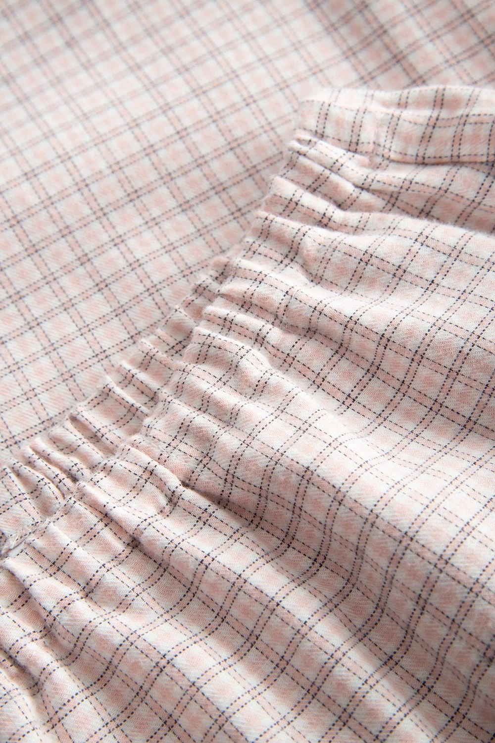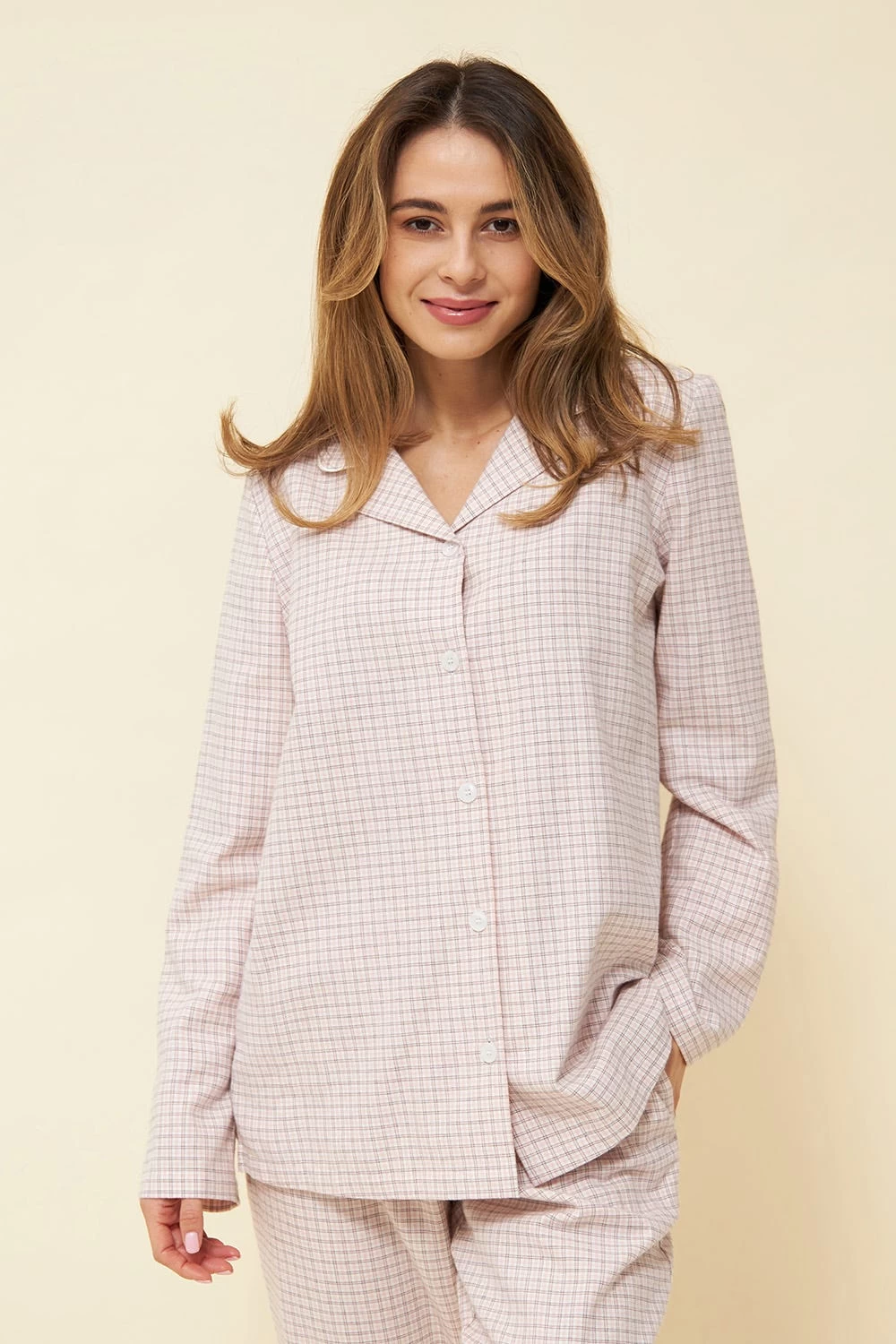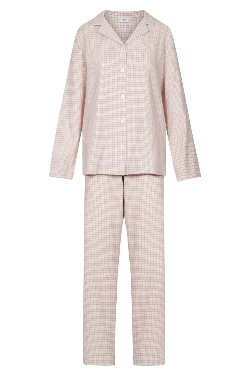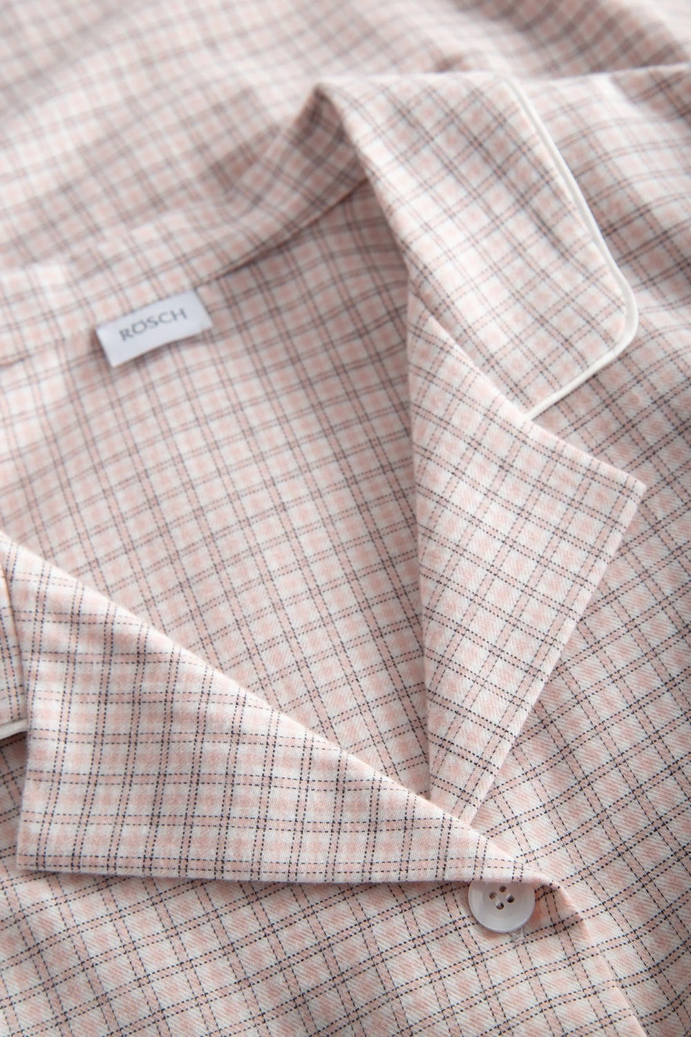 Der Pyjama im Herrenstil mit Reverskragen ist vorne durchgeknöpft. Das Oberteil hat seitlich kleine Schlitze. Die Hose ist gerade geschnitten und hat seitliche Taschen. Die schmale Paspel am Kragen ist farblich passend abgestimmt.