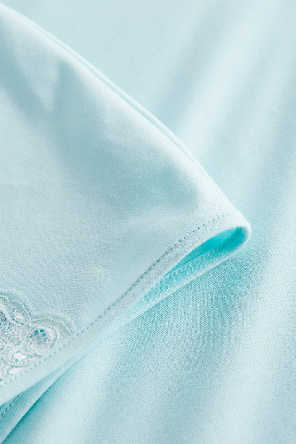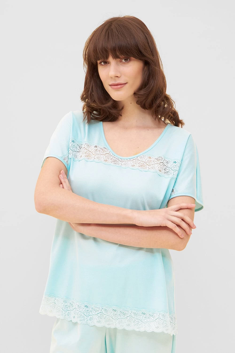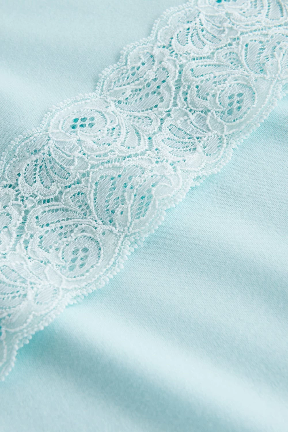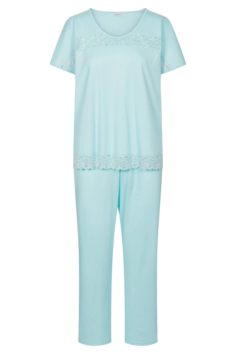 Eleganter Pyjama in Uni mit feinen Spitzendetails am Dekolleté und Oberteil-Saum. Die überschnittenen Schultern und die Hose mit Gummibund sorgen für Bequemlichkeit.