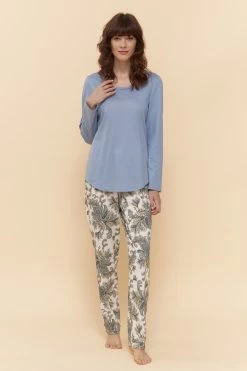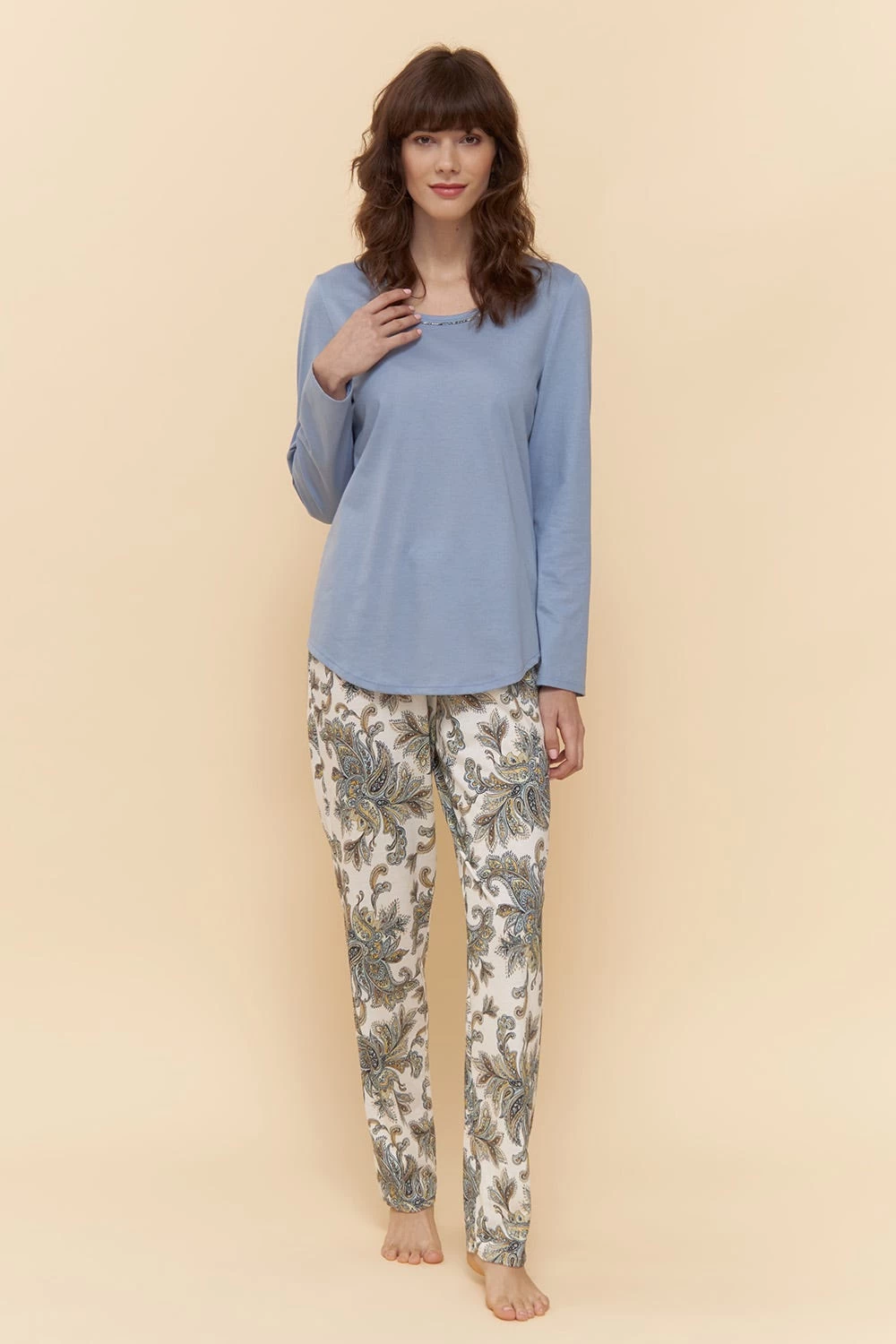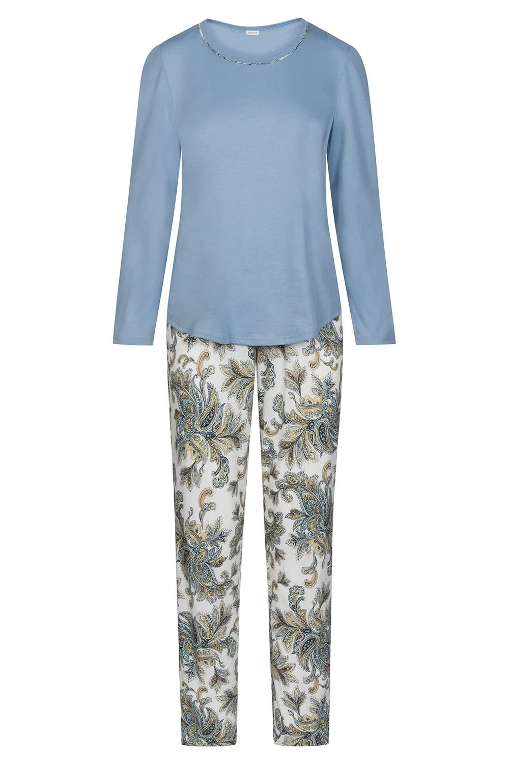 Pyjama mit bedruckter Hose und Oberteil in Uni passend abgestimmt. Der Rundhalsausschnitt ist eingefasst und mit einer schmalen Paspel aus Druckstoff verarbeitet. Der Saum ist leicht abgerundet.