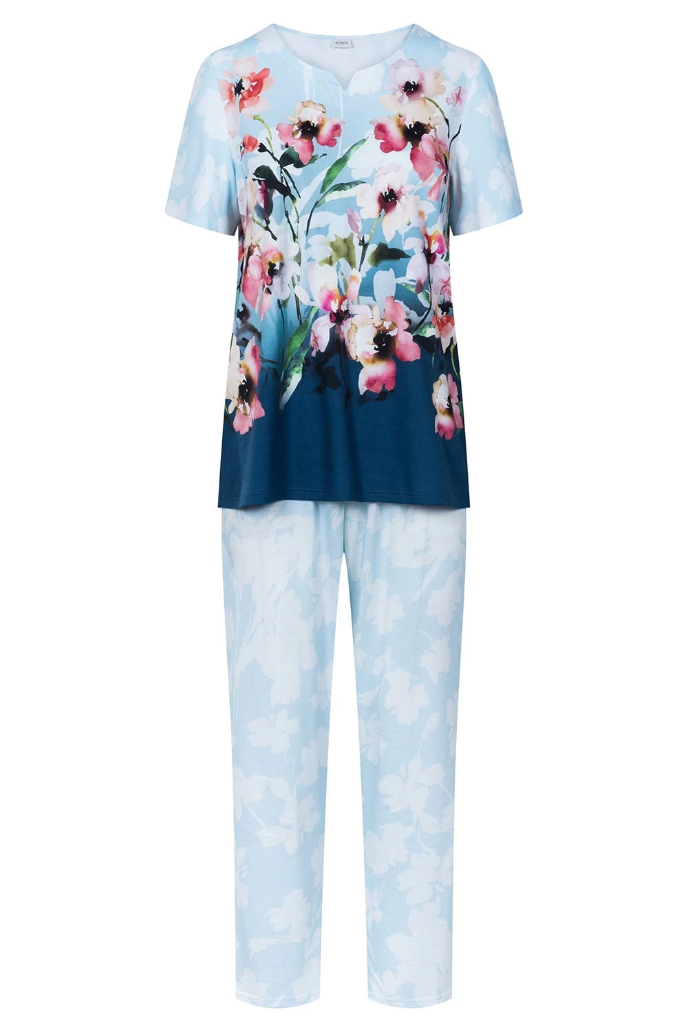 Pyjama mit Hose in schlichtem Blumen-Druck und Oberteil mit platziertem, floralem Druck. Das Set aus angenehmem Single Jersey ist besonders bequem durch den Gummibund der Hose und dem kurzen Schlitz des Ausschnitts.