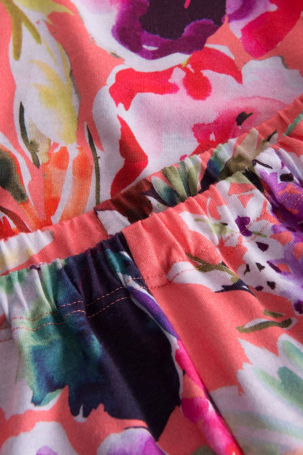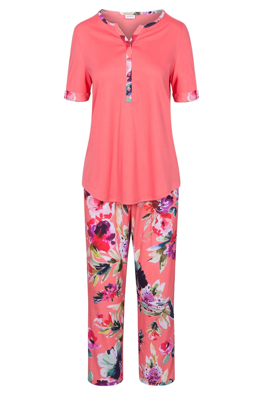 Pyjama mit 7/8-Hose im floralen Druck und T-Shirt in Uni. Besondere Details sind der eingefasste Rundhals, die Knopfleiste und die Ärmel mit Umschlag, die alle im floralen Druck gehalten sind. Der seitlich gerundete Saum und die Hose mit Gummibund sorgen für Bequemlichkeit.