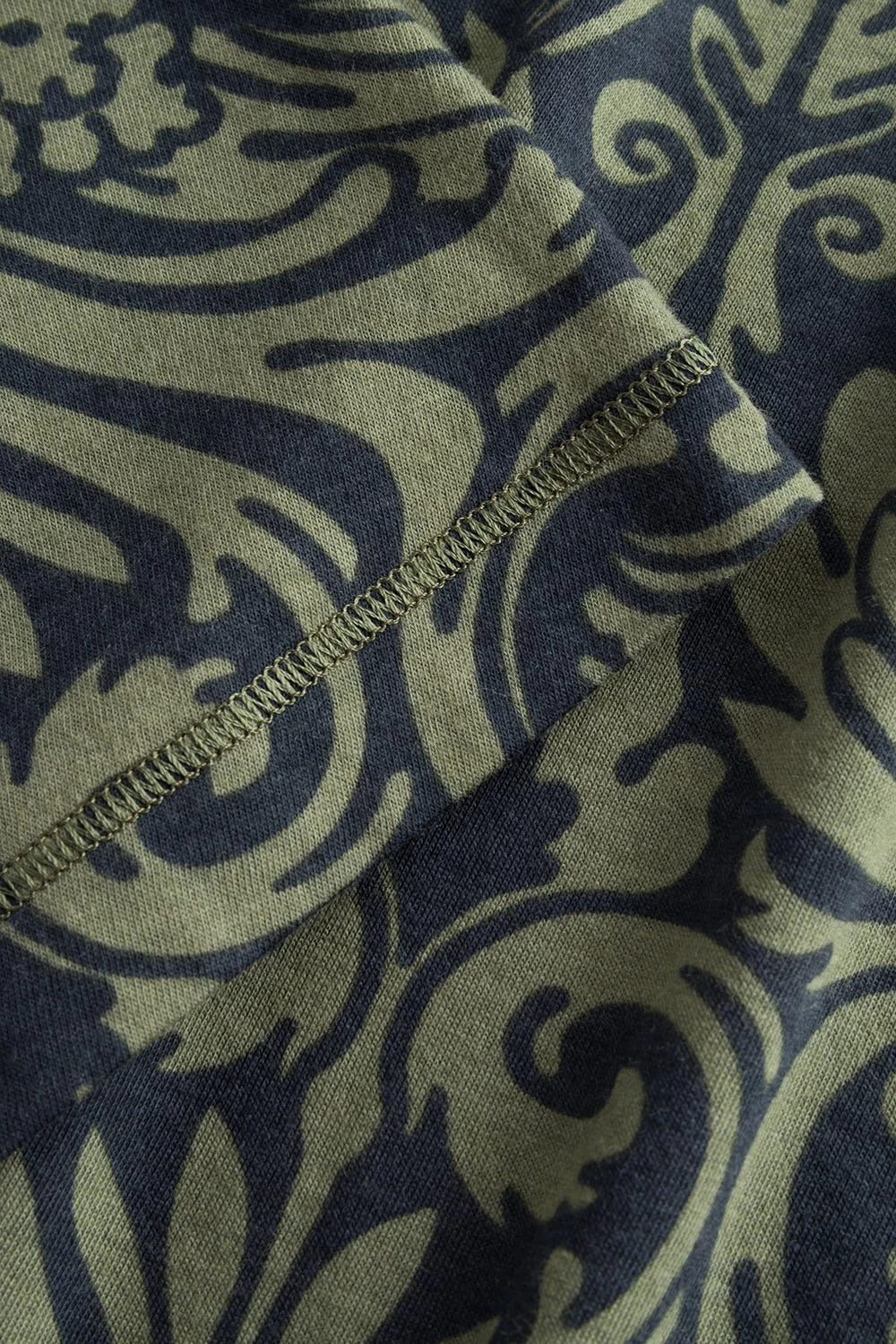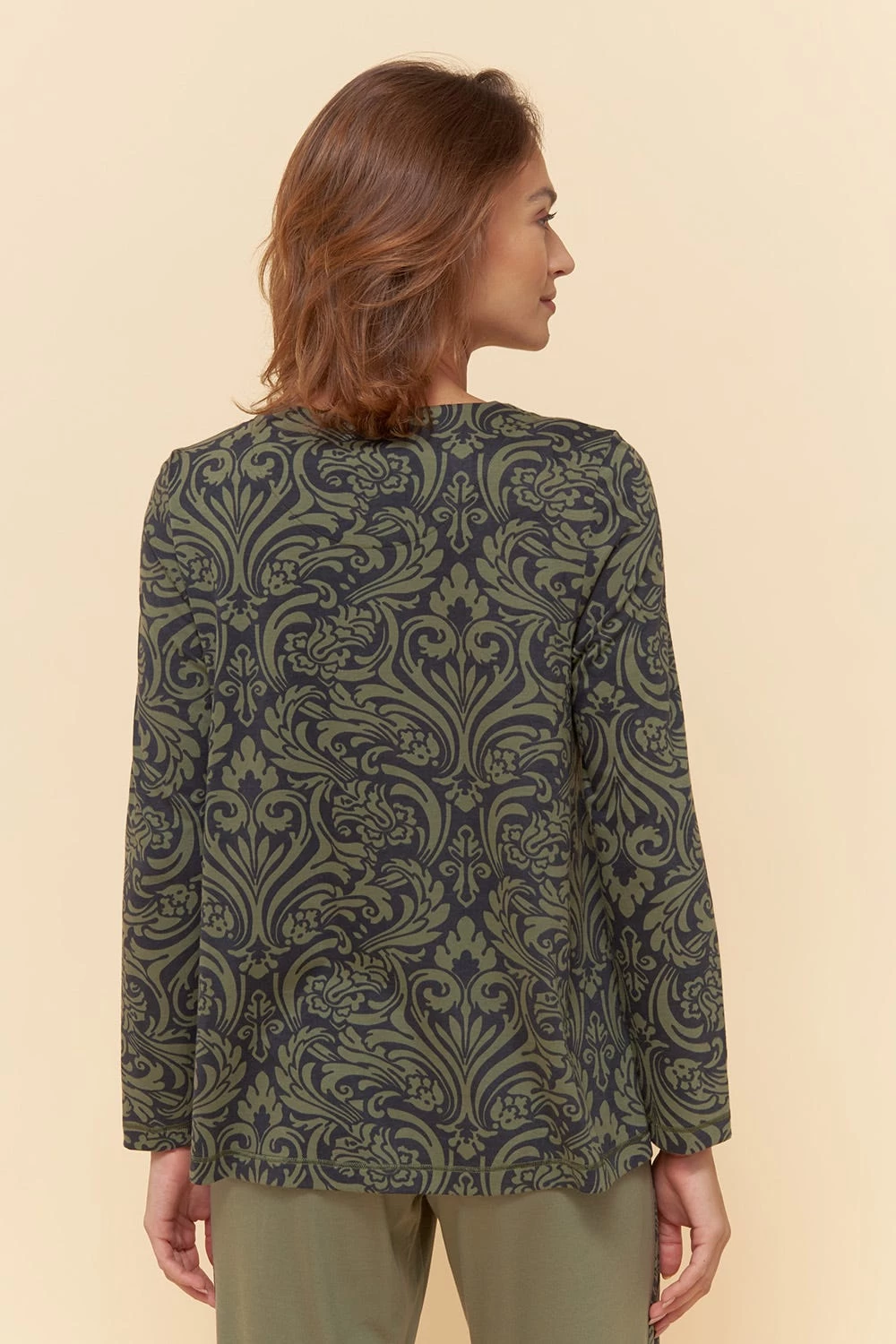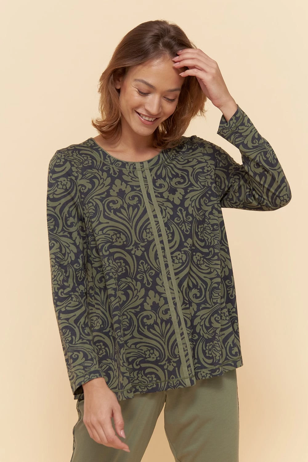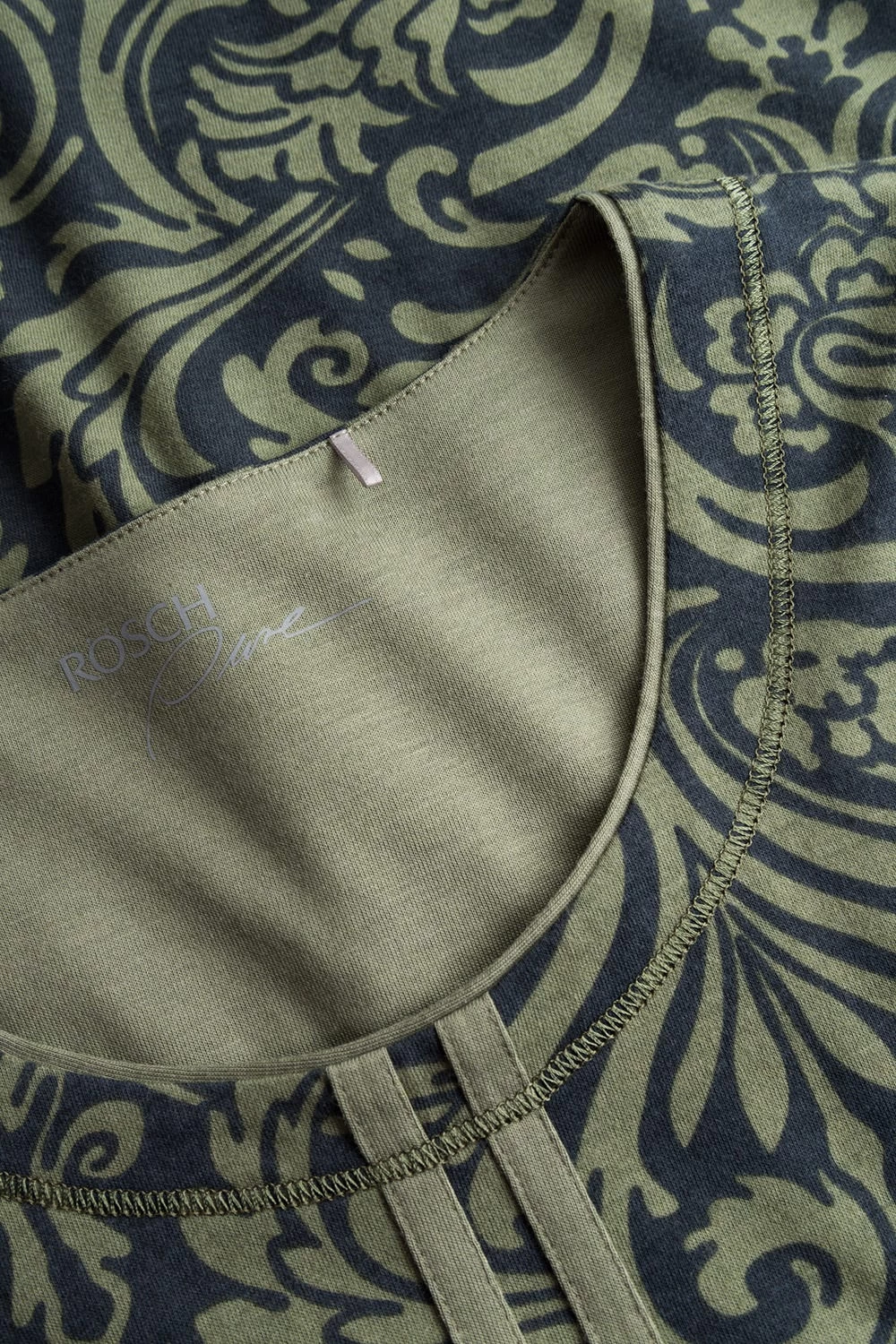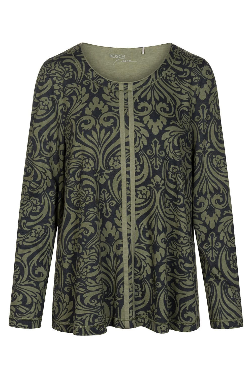 Bedrucktes Shirt mit leicht aufgedrehtem Saum. Der Rundhals ist mit kleiner Paspel verarbeitet. In vorderer Mitte sind zwei schmale Bänder aufgenäht, die für eine charmante Linie sorgen.