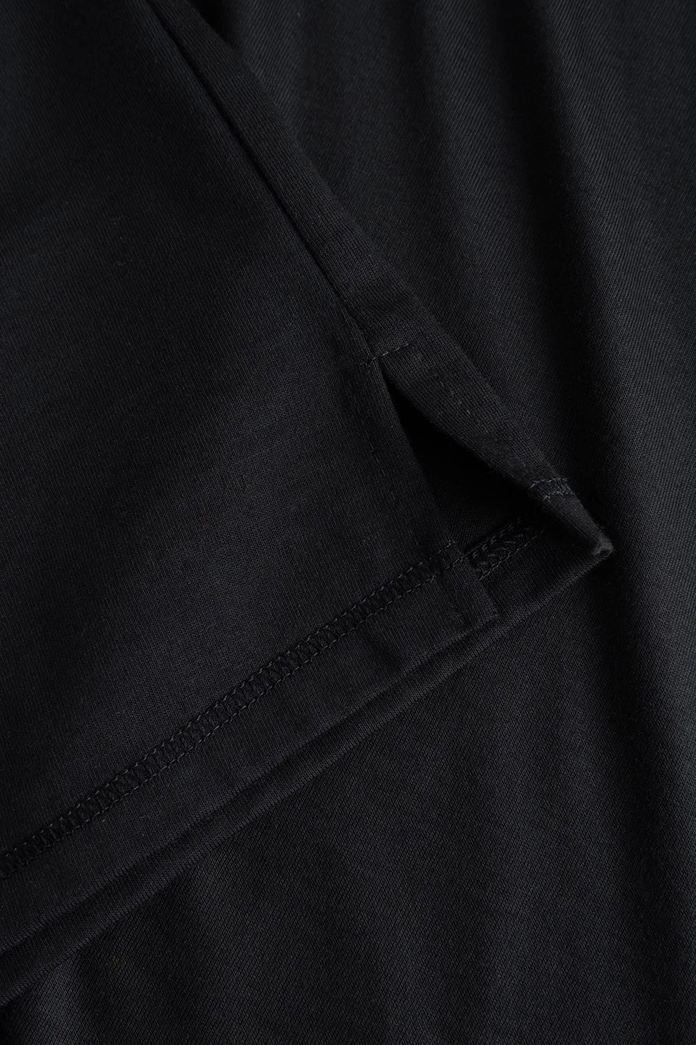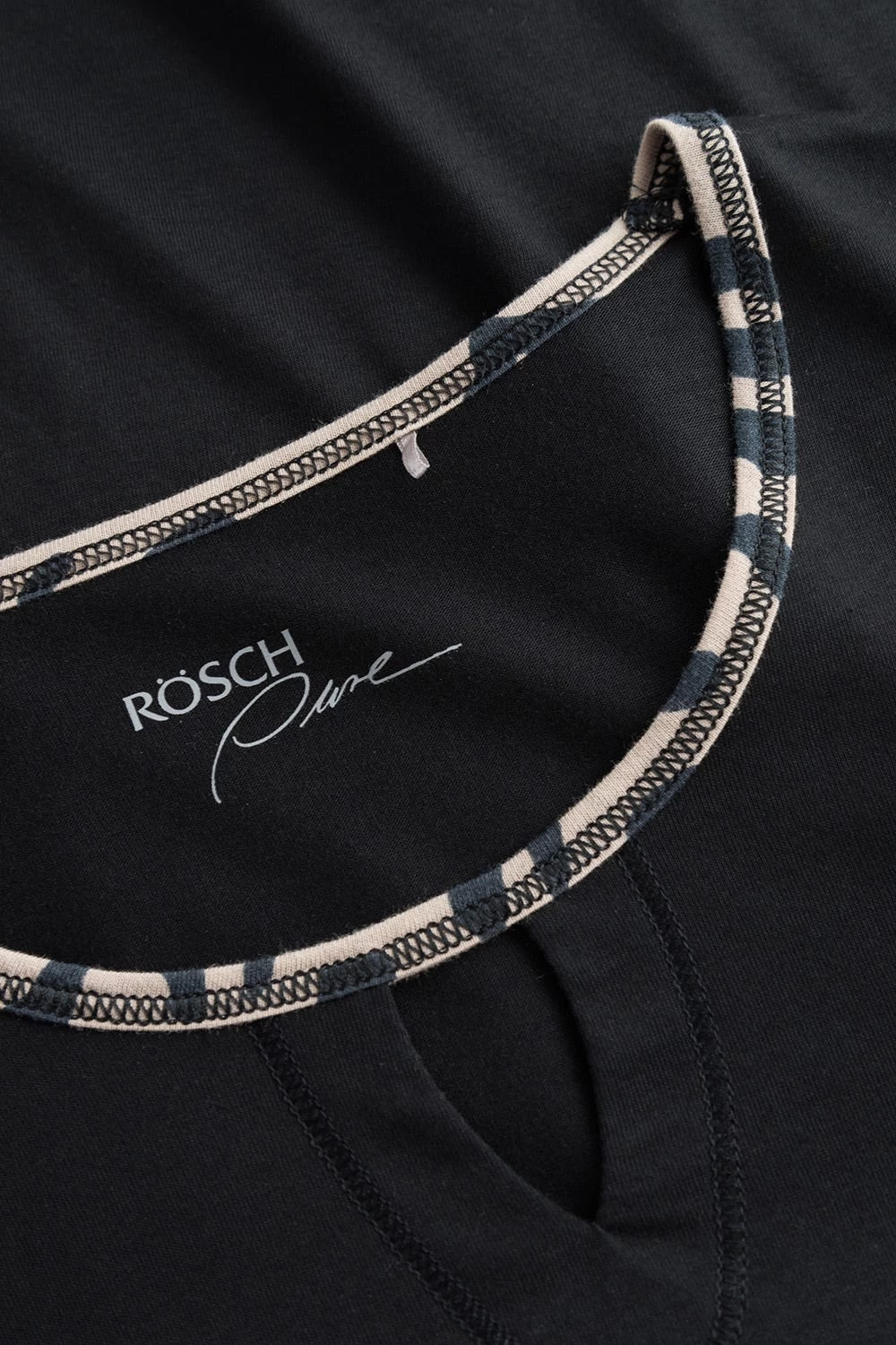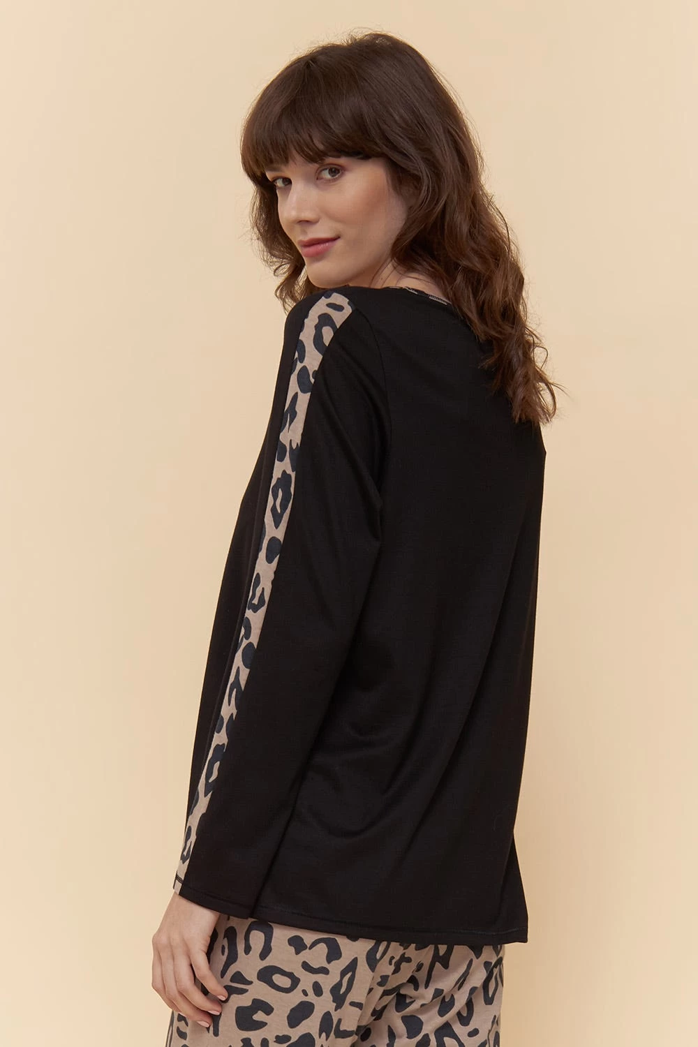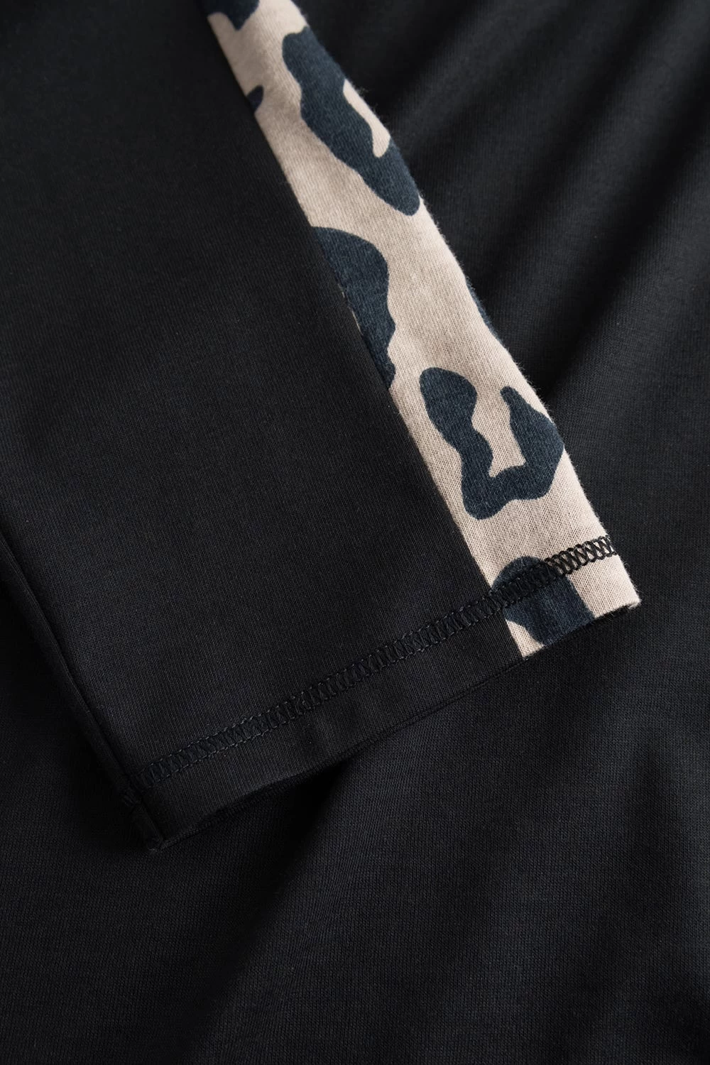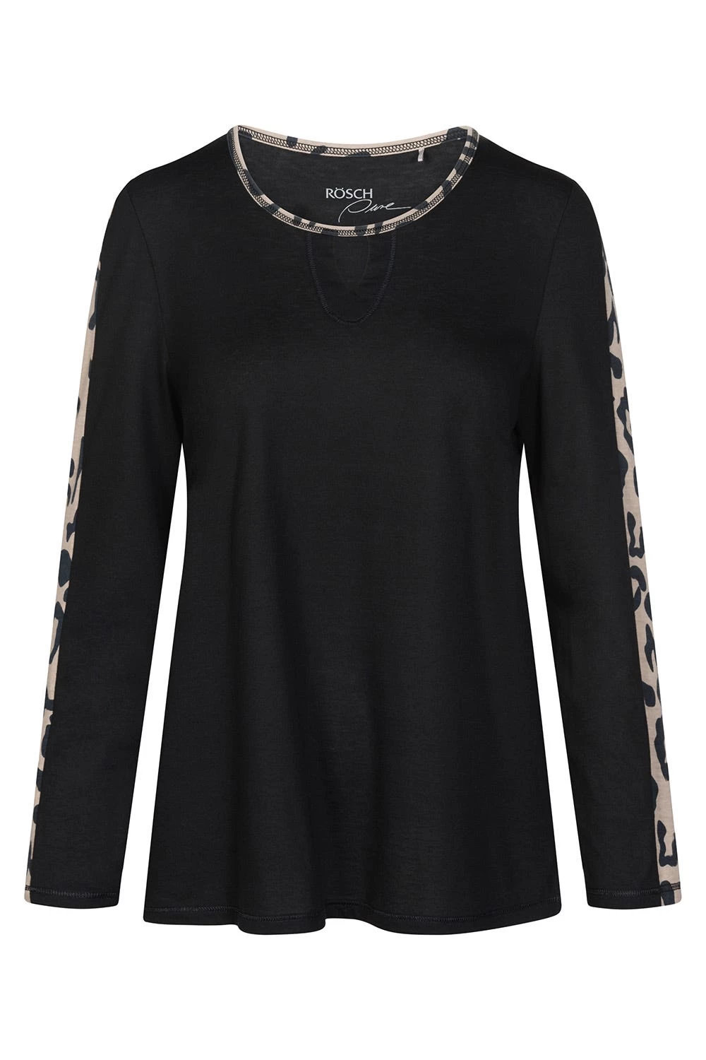 Shirt mit kleinem Schlitz am Halsausschnitt. Seitlich gibt es kleine Schlitze am Saum, an den Ärmeln ist ein Einsatz aus Druckstoff eingenäht. Der Einfass am Hals ist ebenfalls aus Druck gefertigt.