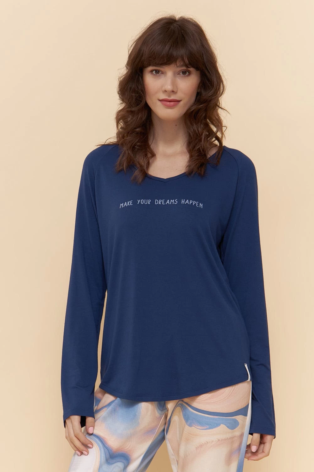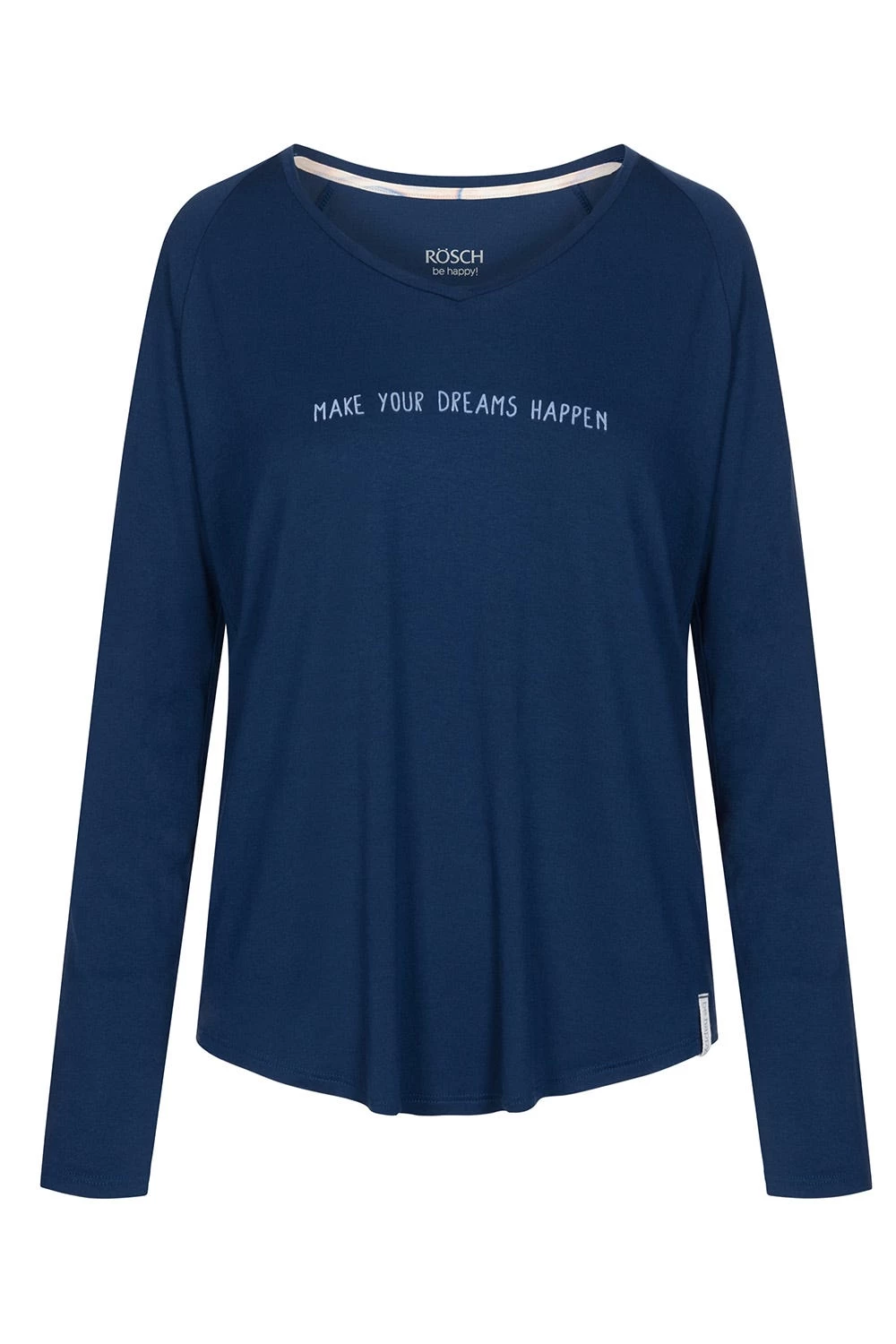Oberteil mit Raglanärmeln, V-Ausschnitt und Schriftzug.