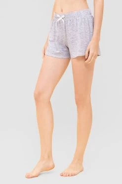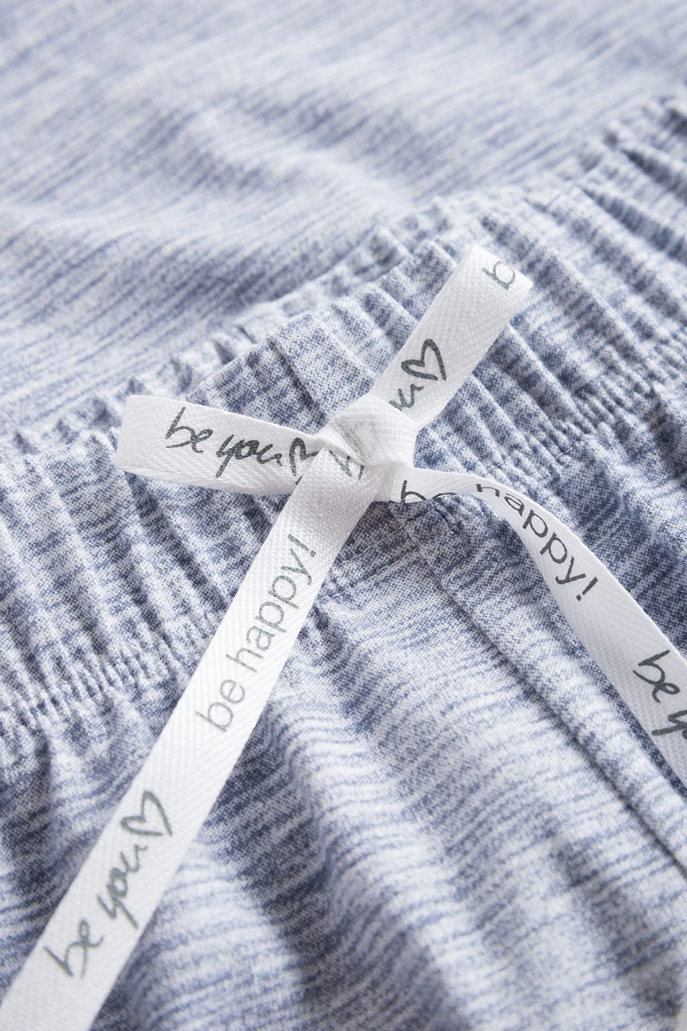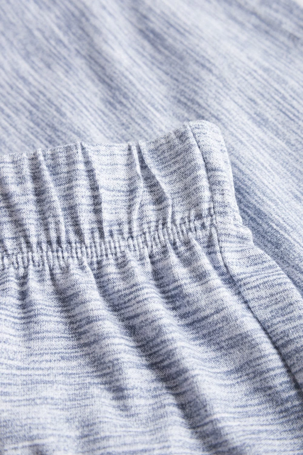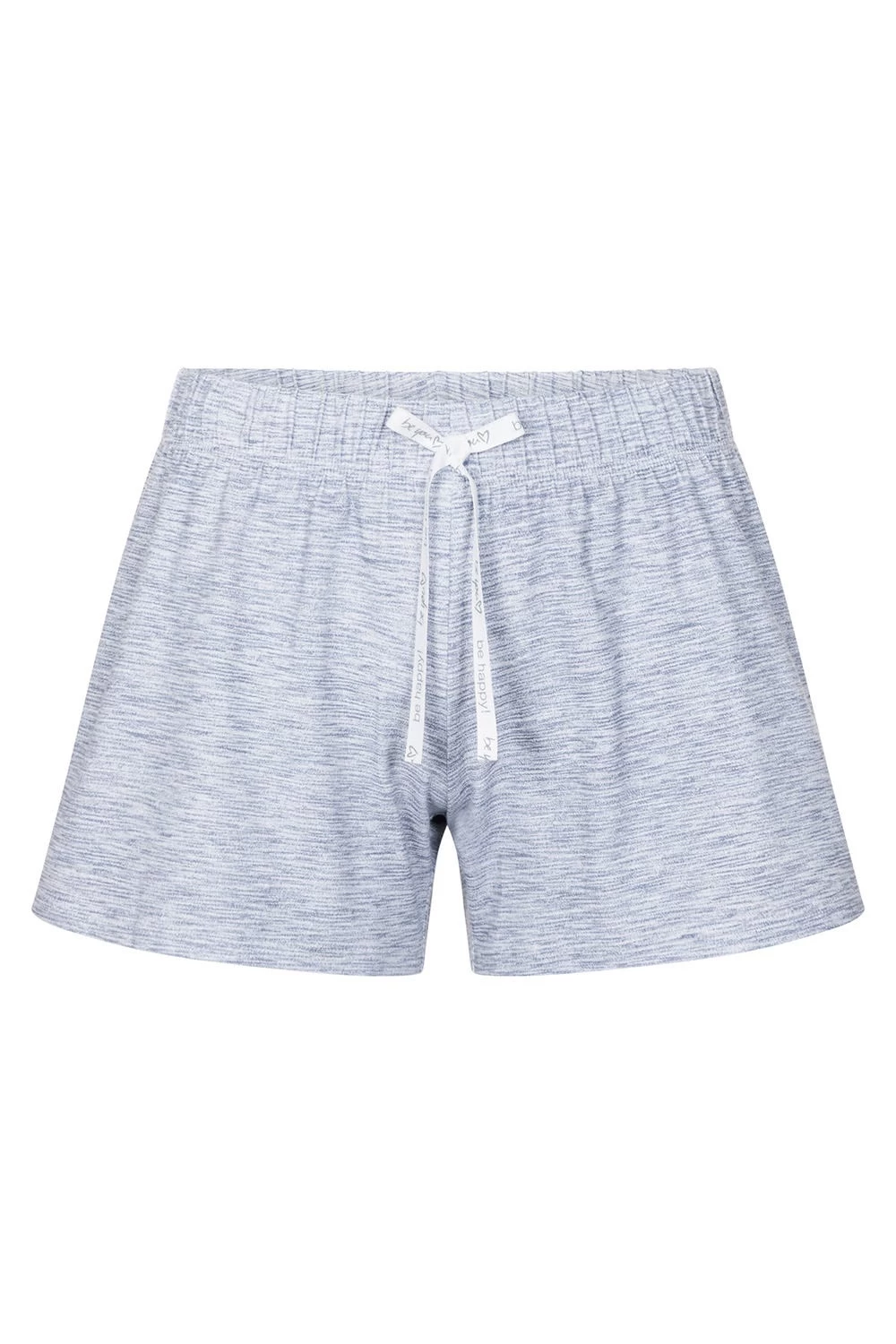 Das Design besteht aus Bio-Baumwolle mit Elasthan und ist im blauen Melange-Druck. Die kurze Hose besitzt eine entspannte Form und eine Zier-Schleife.