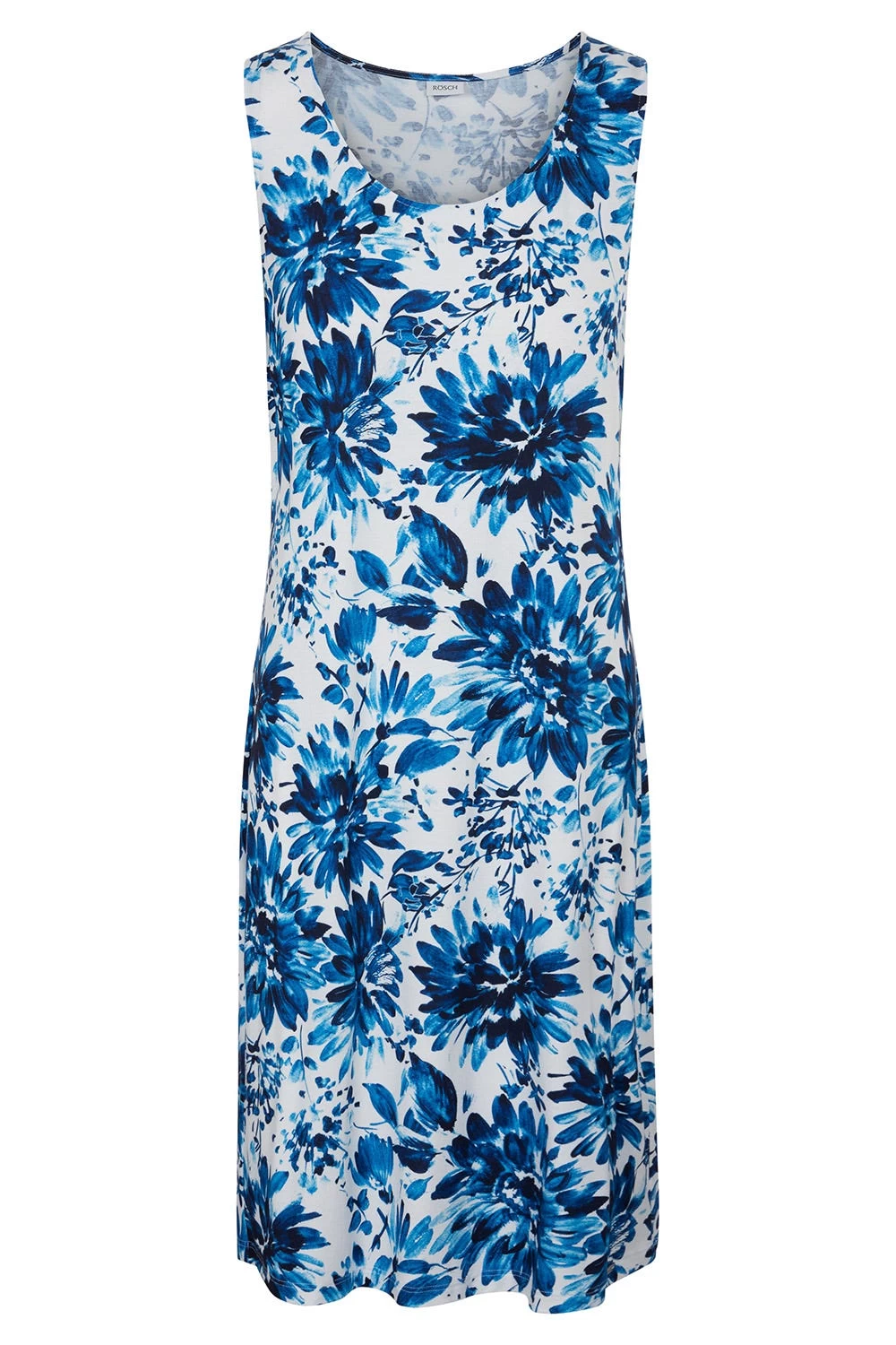 Ärmelloses Kleid mit Rundhalsausschnitt im handgemalten Blume-Druck. Das Strandkleid ist gerade geschnitten.