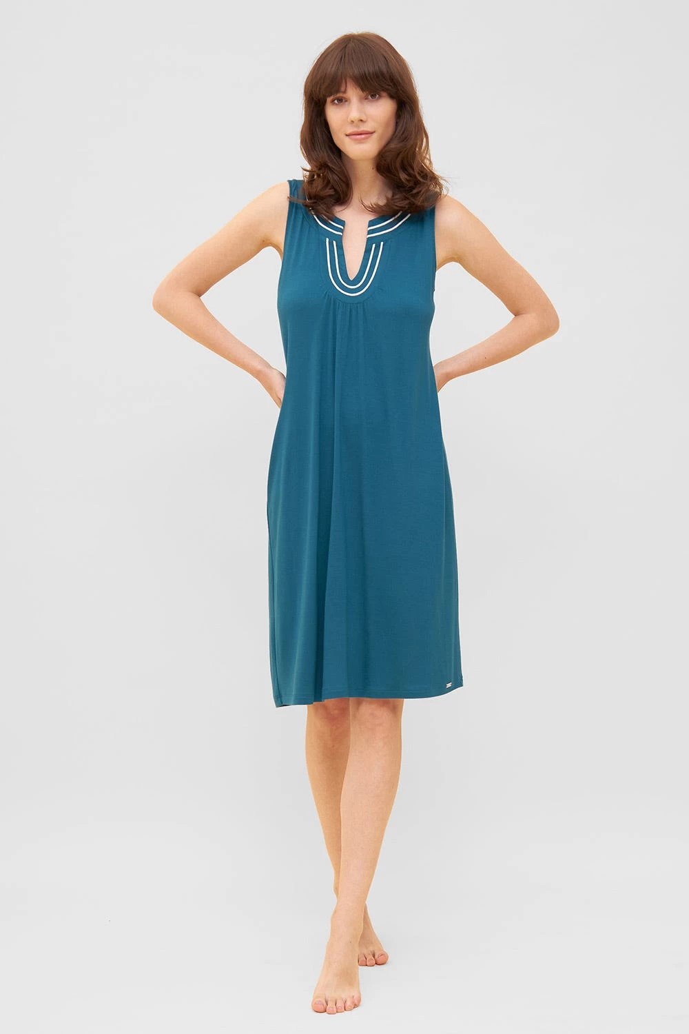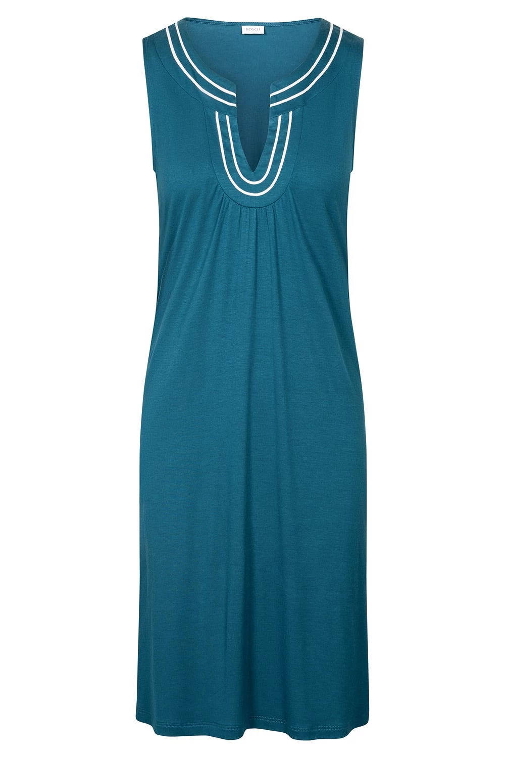 Luftiges Kleid ohne Arm aus angenehm kühlem Viskose-Elasthan Jersey. Das Kleid ist im klassischen Stil durch Paspelierung am Hals.