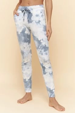 Schlanke Jogging Hose aus bedruckter Sweatware im blauen Batik-Stil. Seitlich hat die Hose Eingrifftaschen und an der rechten Poseite befindet sich eine aufgesetzte Tasche. Der breite Bund sorgt für Bequemlichkeit.