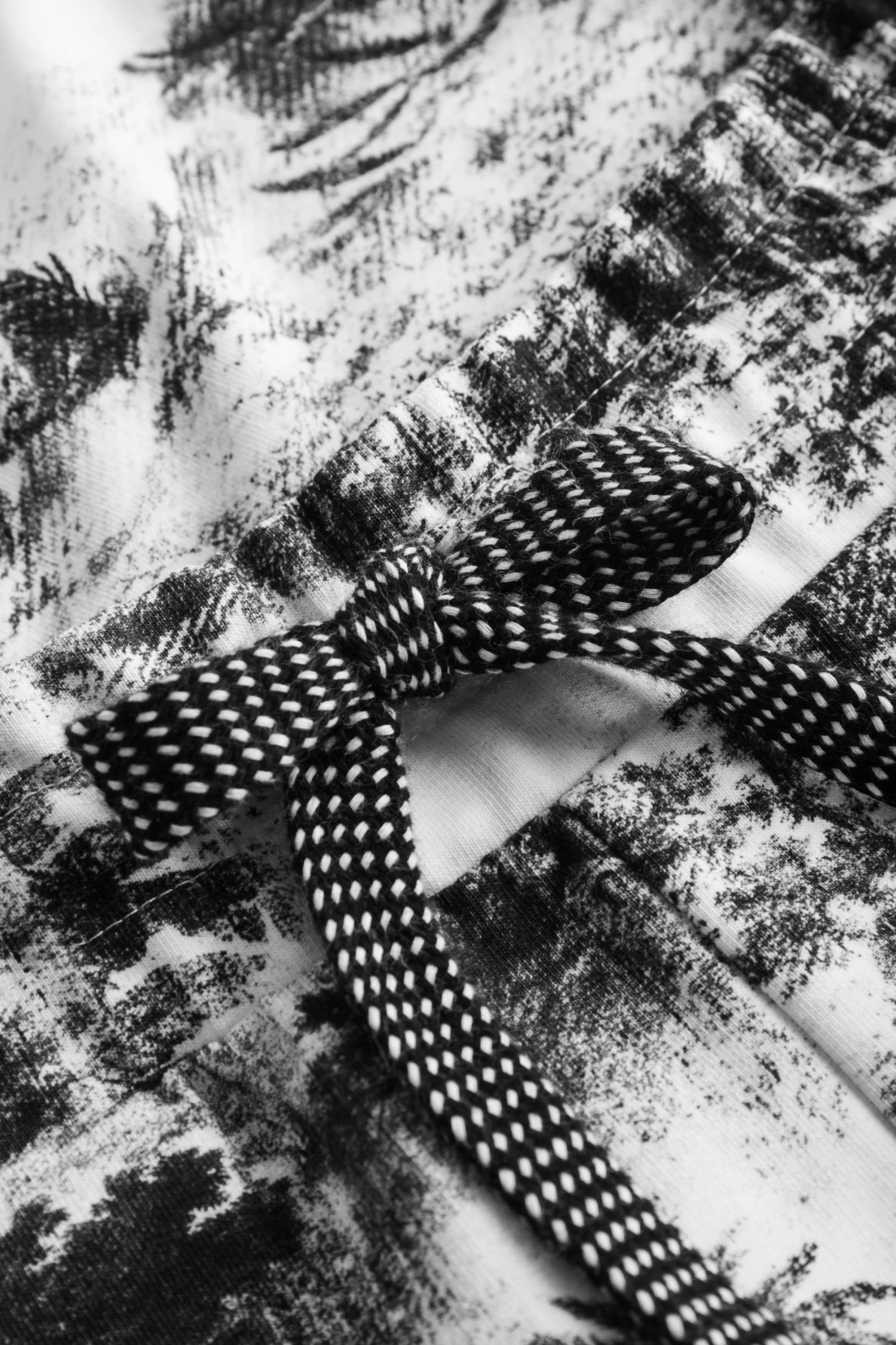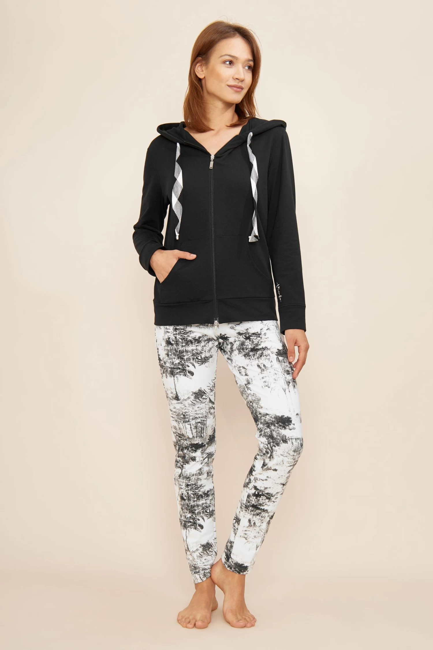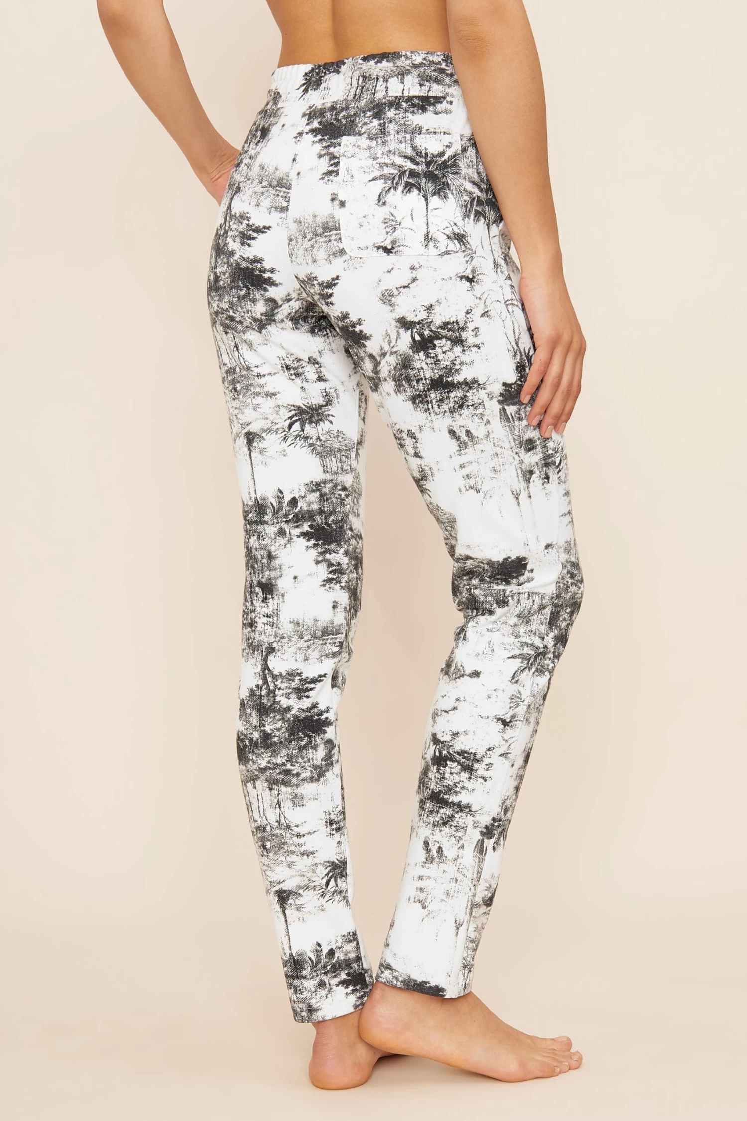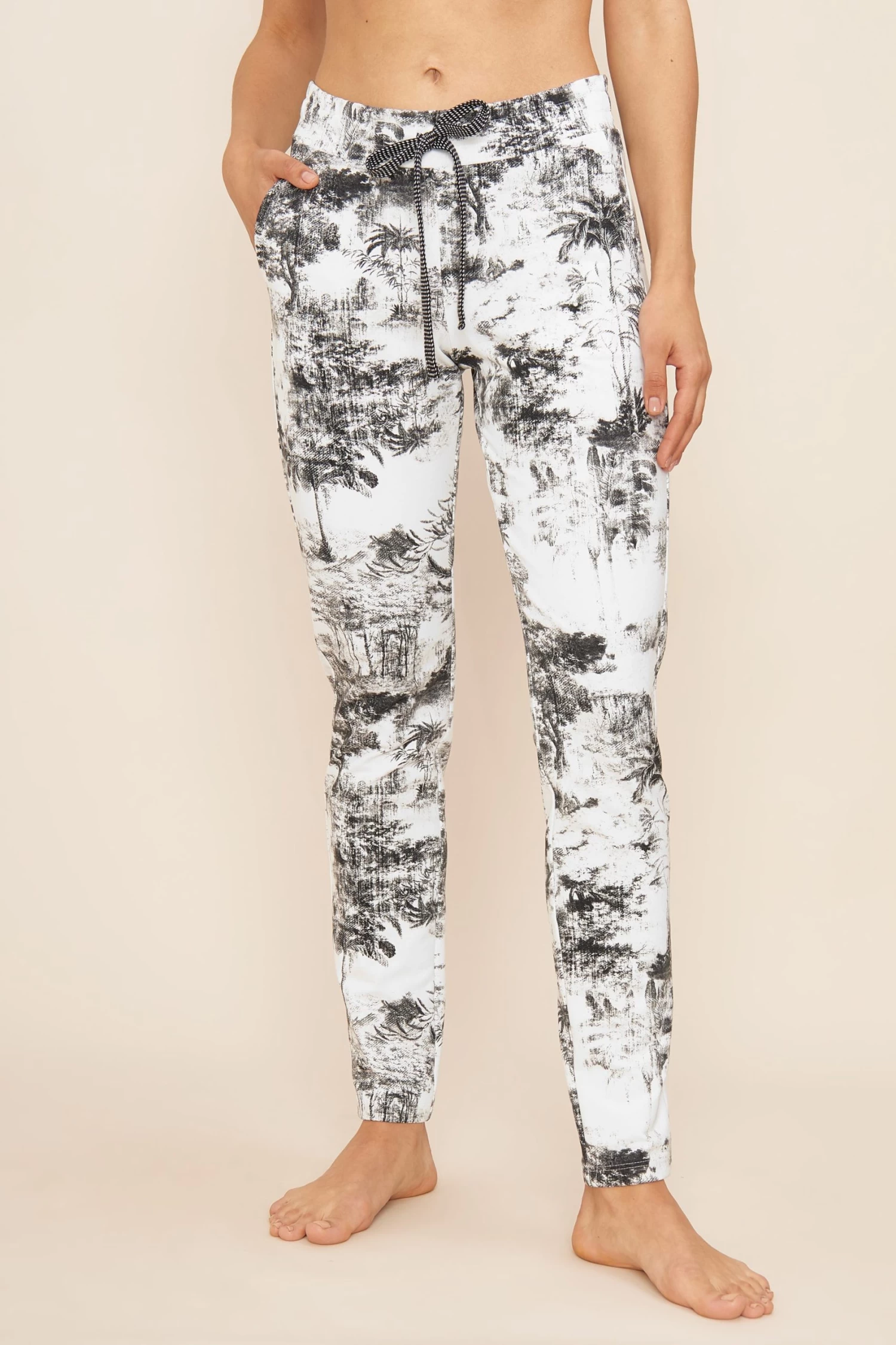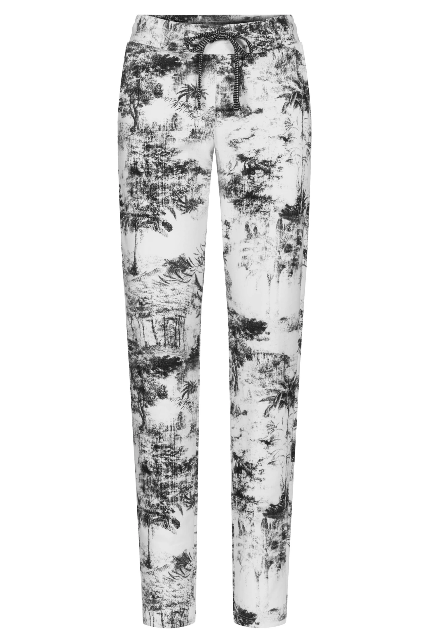 Schmale Hose aus bedruckter Sweat Ware mit seitlichen Taschen und einer Gesäßtasche. Der breite elastische Bund ist mit Kordelzug passend gearbeitet.