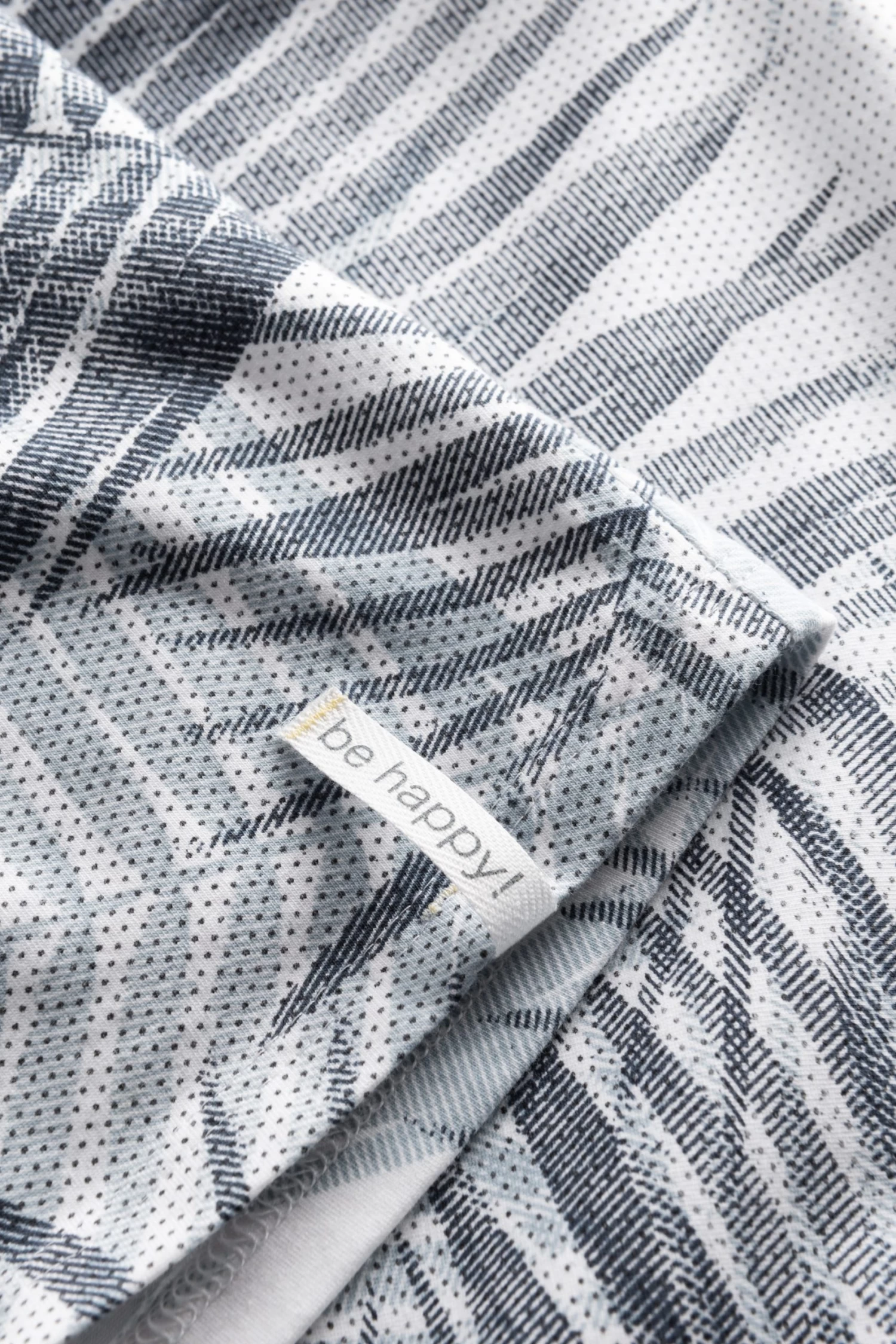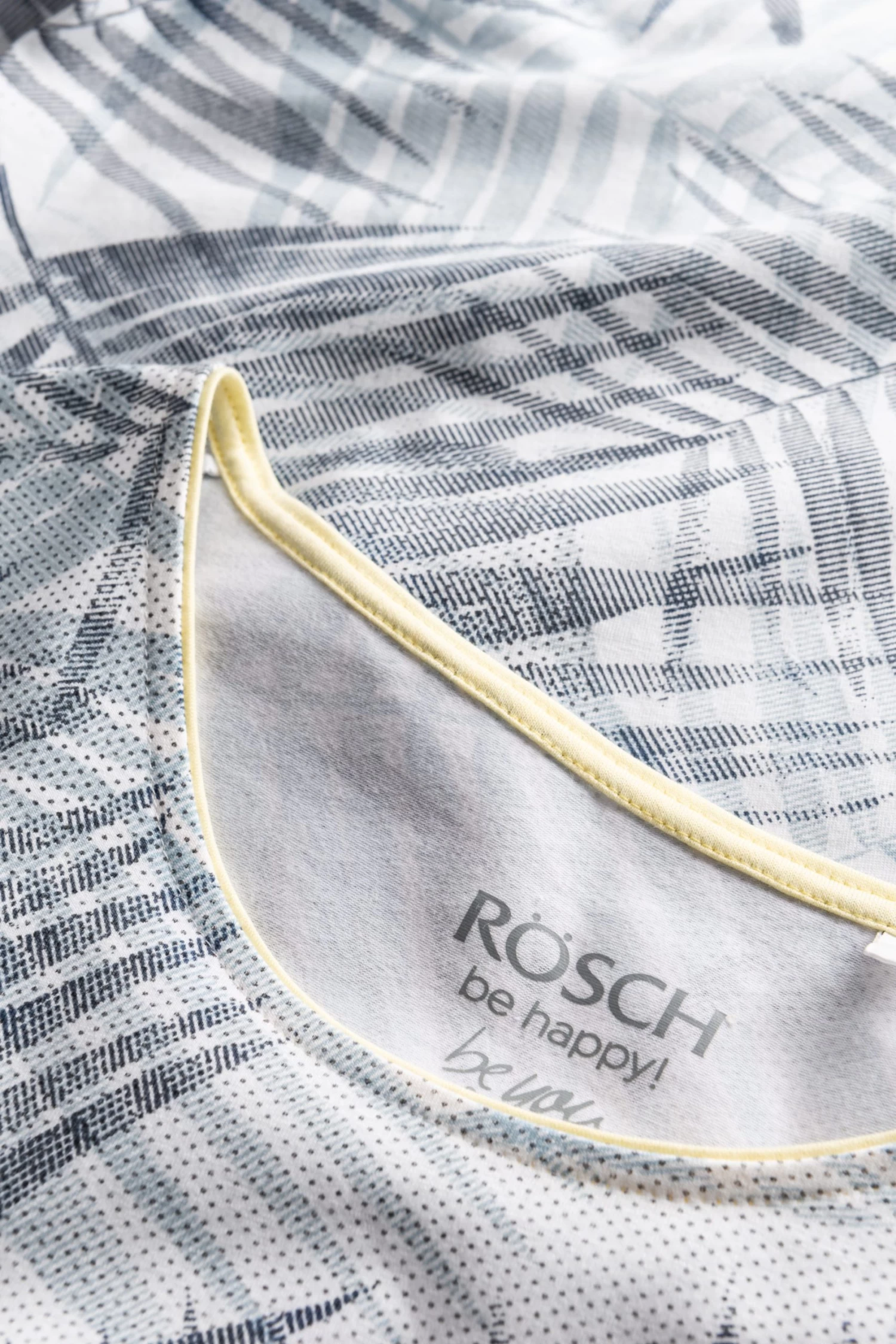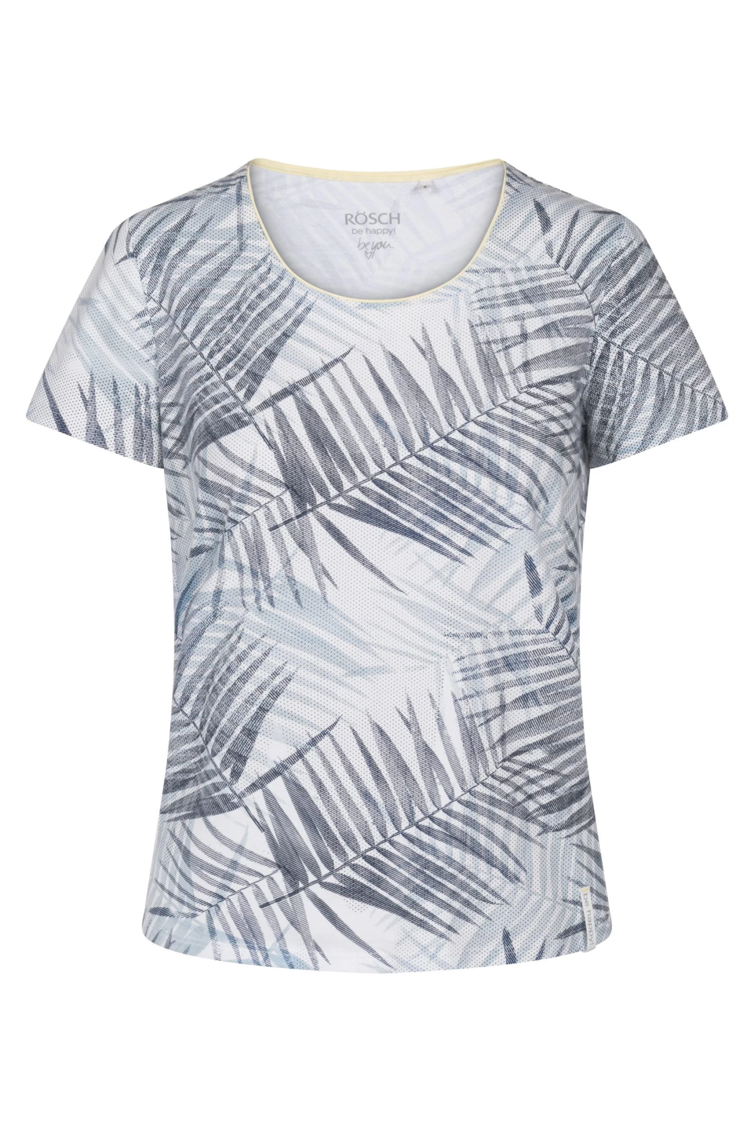 Das Palm-Design unterstreicht den Denim-Charakter im Look. Das Shirt besteht aus Baumwolle-Elasthan und besitzt einen Rundhals mit Details in Pastell-Gelb sowie Kurzam.
