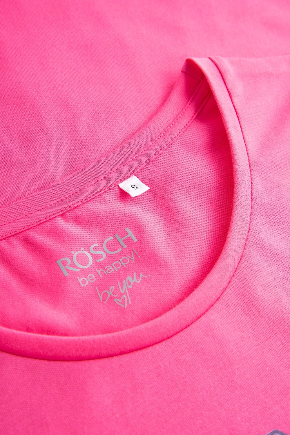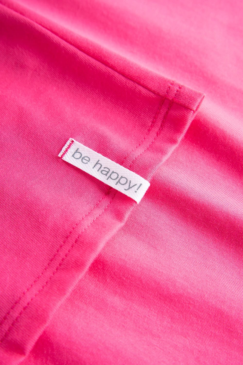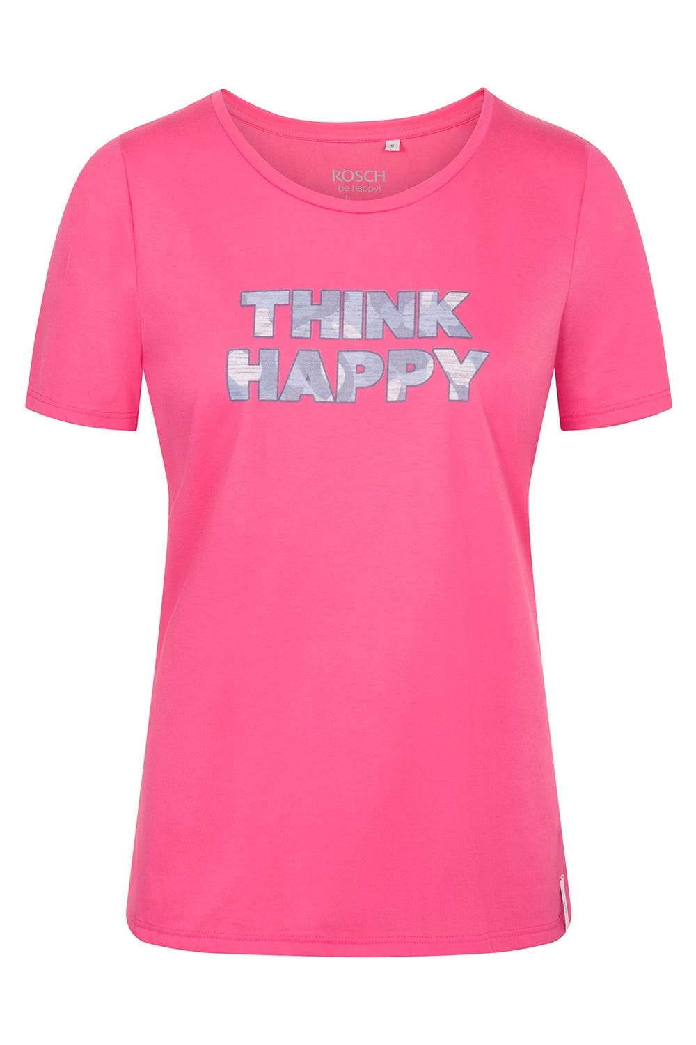 Pinkes T-Shirt mit Schriftzug „Think Happy“ in Camouflage-Druck. Das Oberteil ist im klassischen T-Shirt Schnitt mit kurzen Ärmeln und Rundhals.
