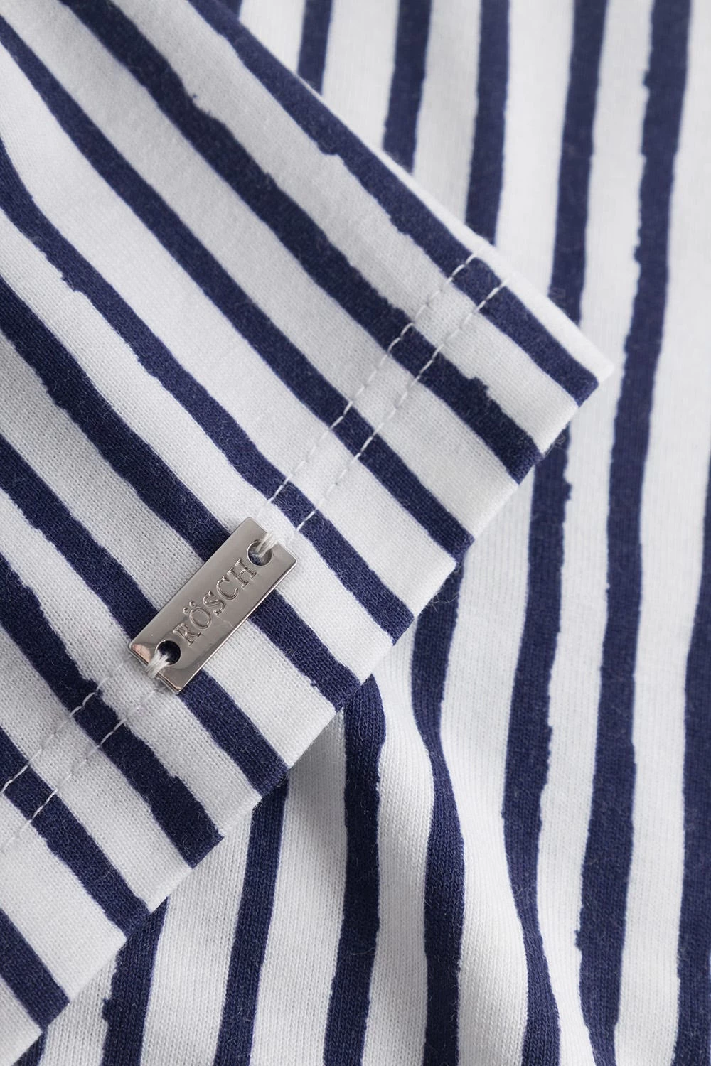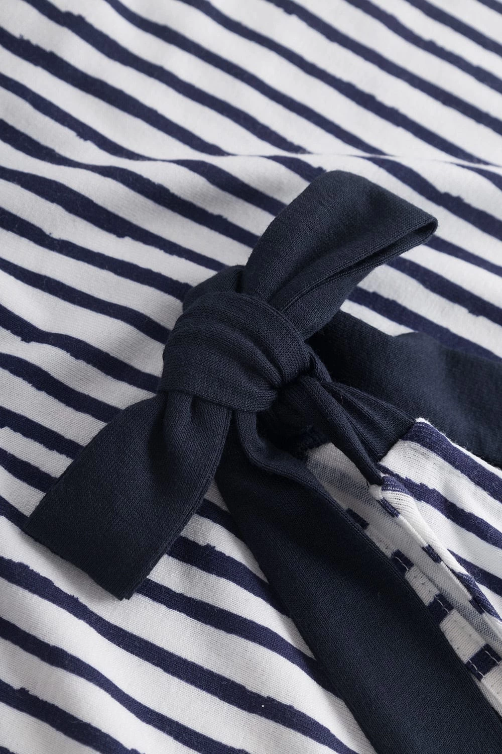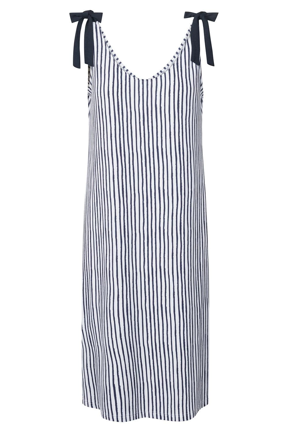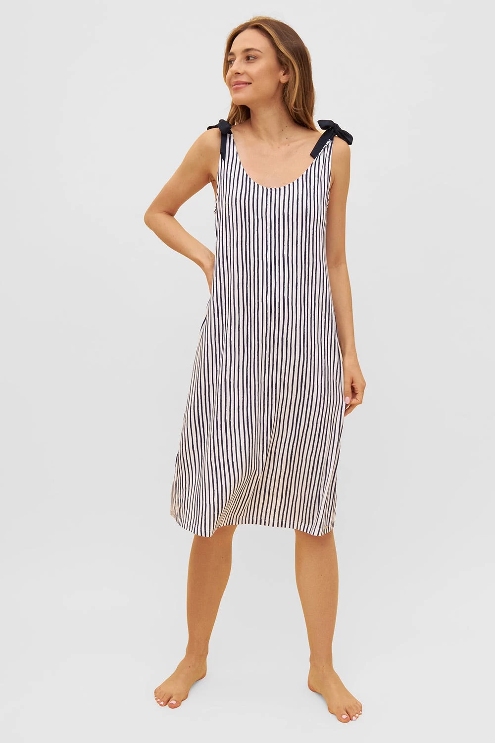 Strandkleid in einem modernen handgemalten Streifen Dessin. Das Kleid hat Träger, die auf der Schulter gebunden werden.