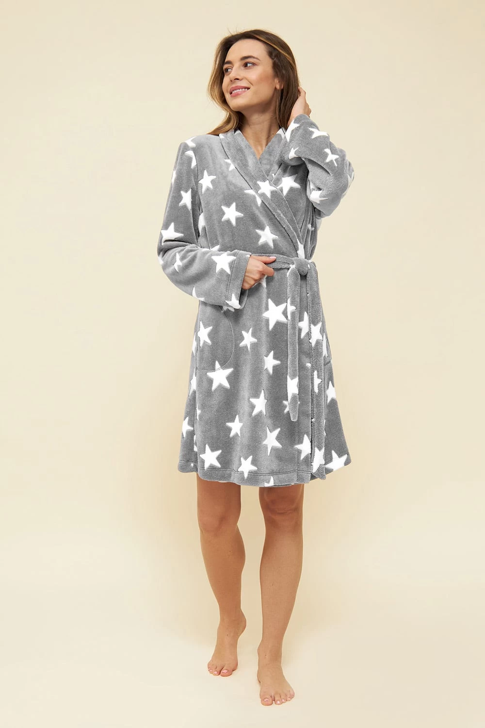 Kuscheliger Wickelmantel aus Flausch mit seitlichen Eingrifftaschen. Der komfortable Schalkragen schmiegt sich angenehm an den Hals.